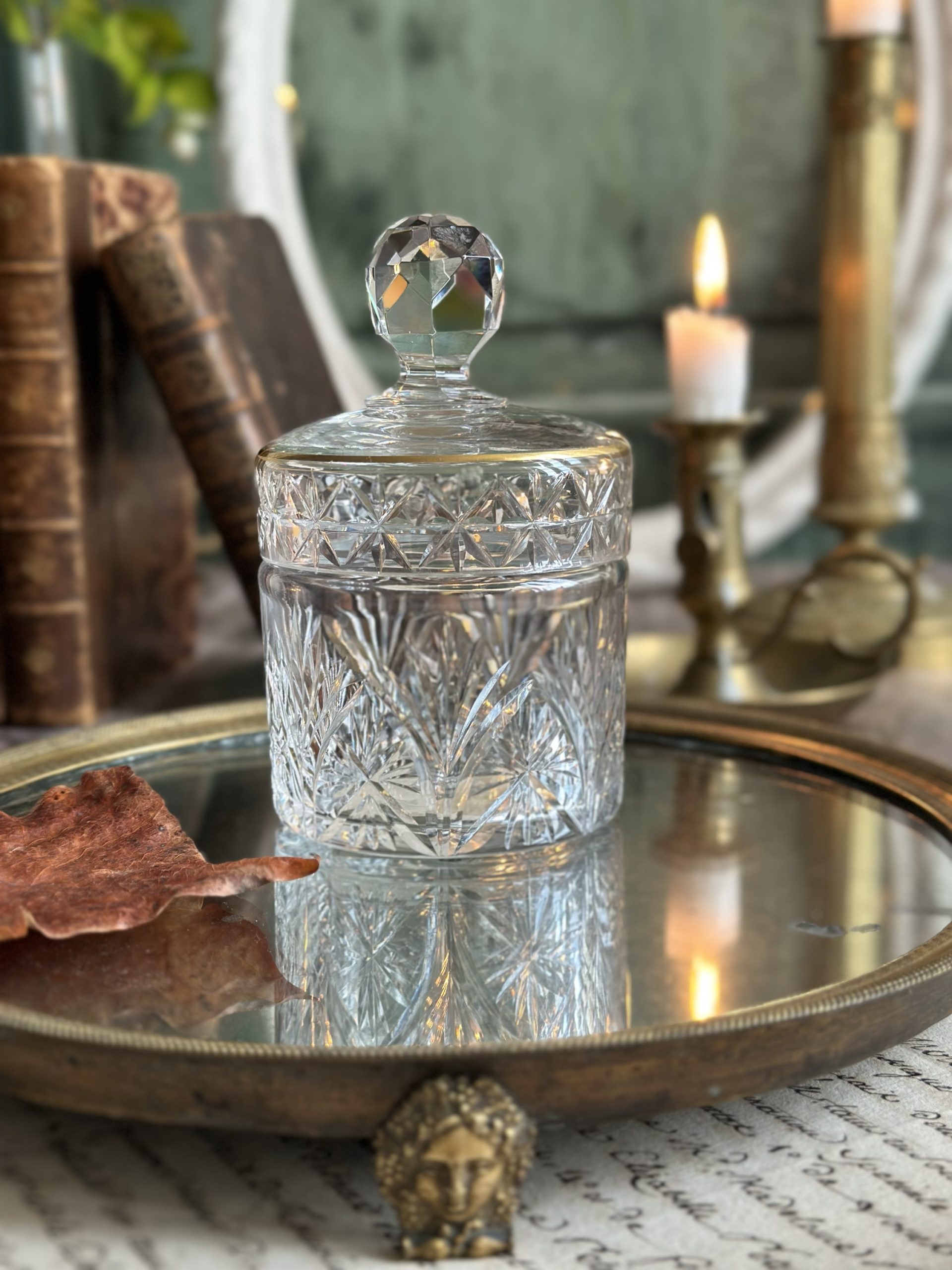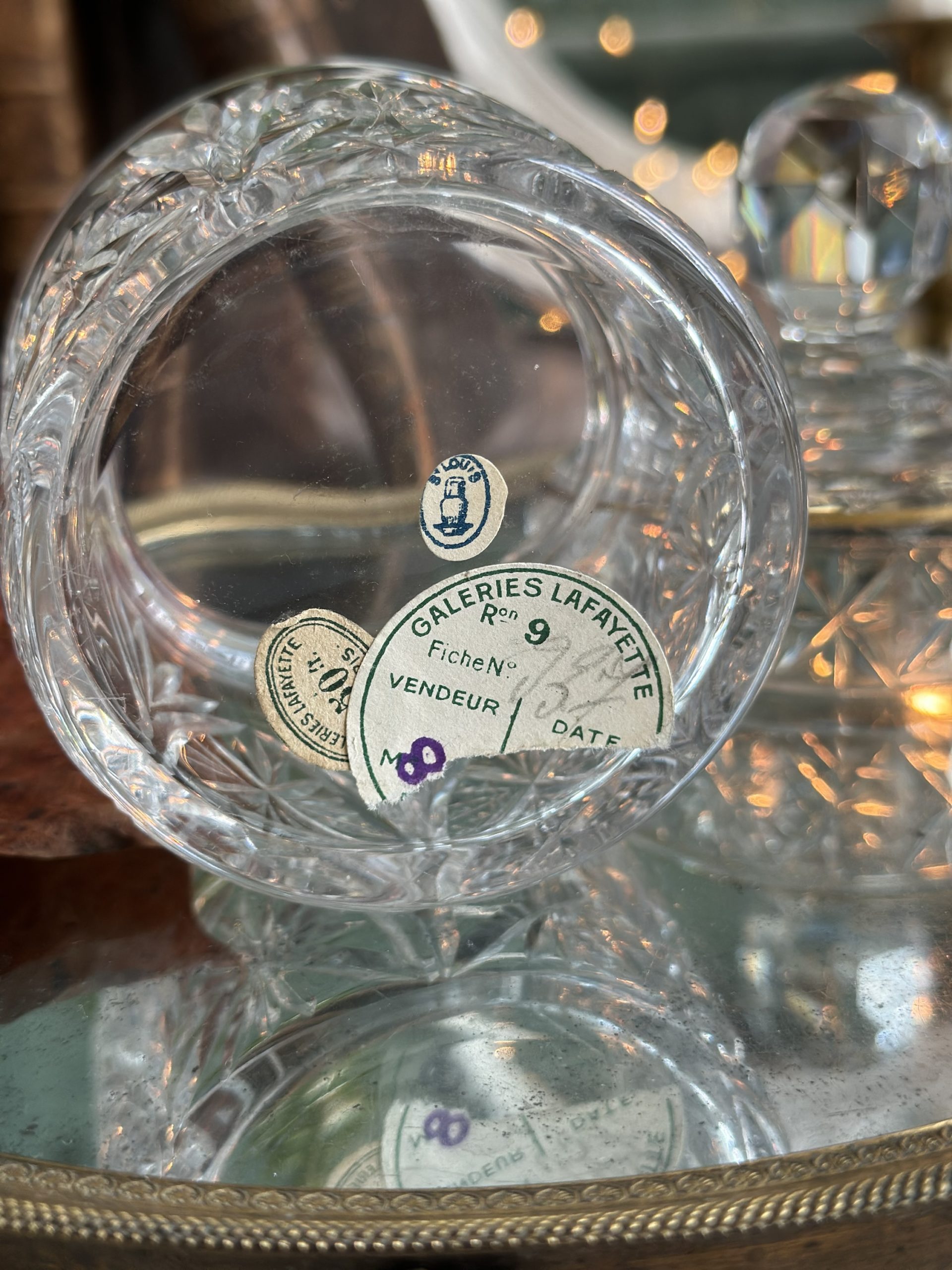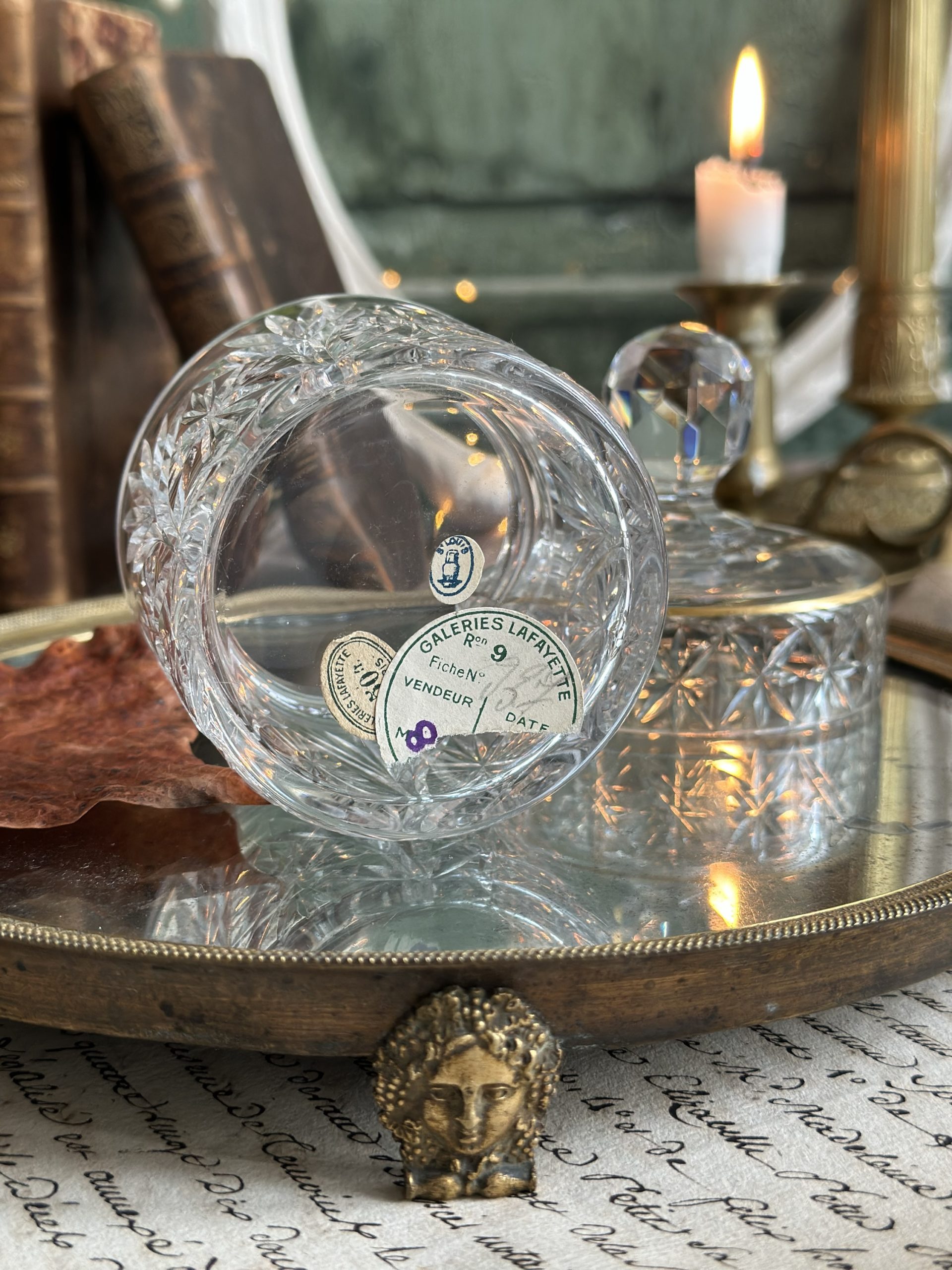 Boite à poudre cristal St Louis pour Galleries Lafayette – datant d’avant 1936 – étiquette originale