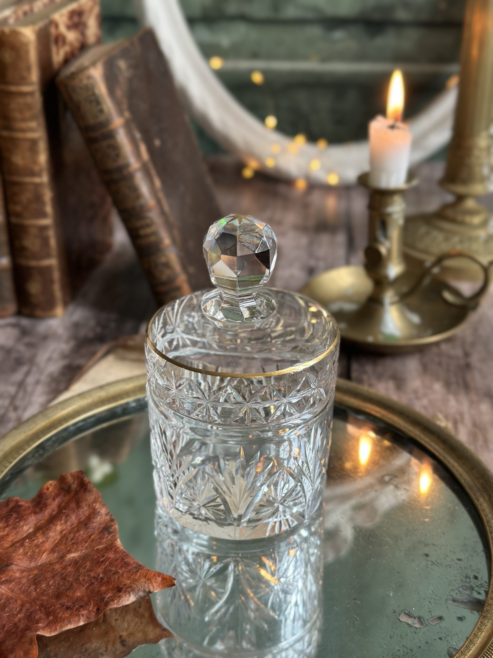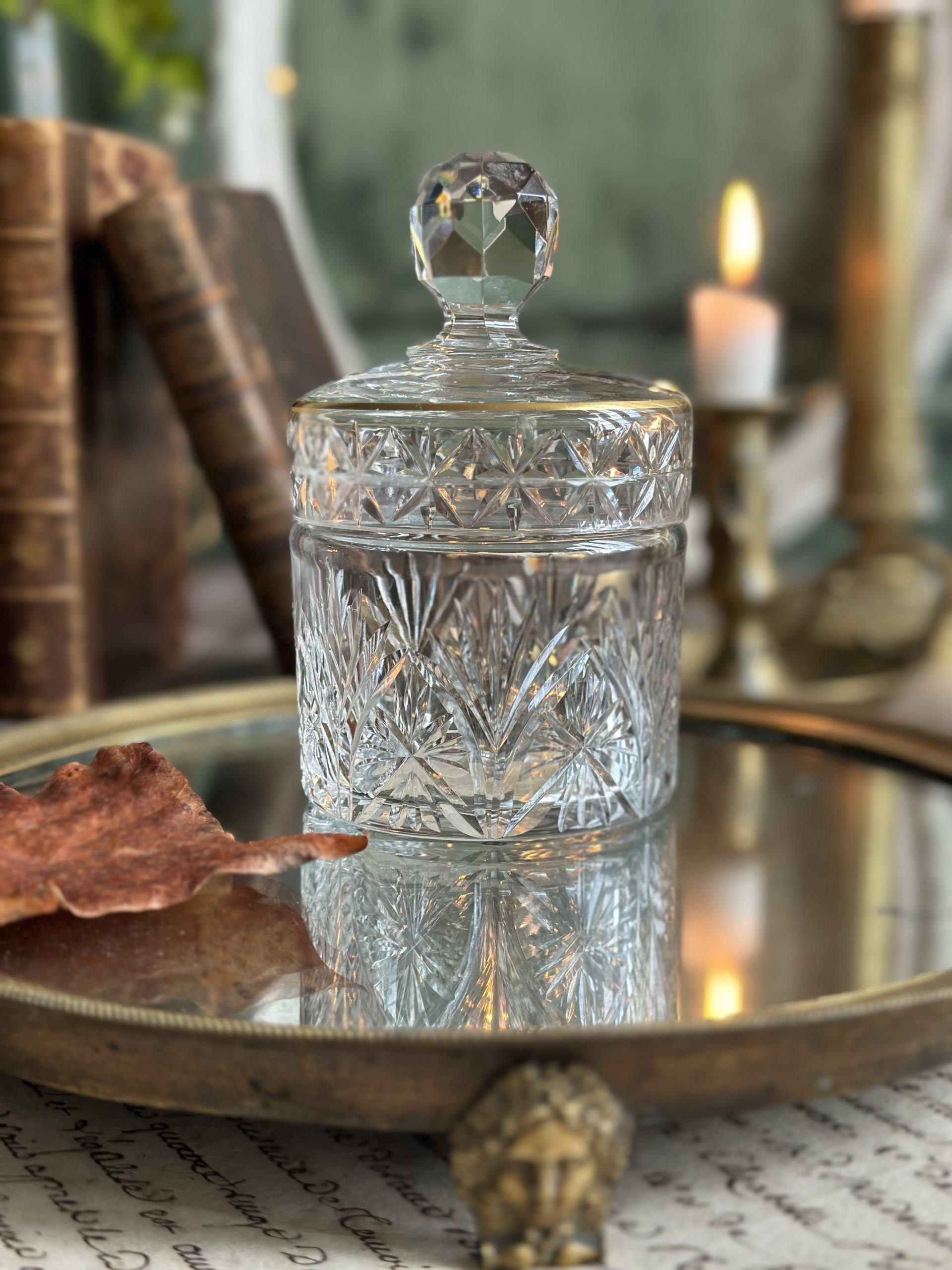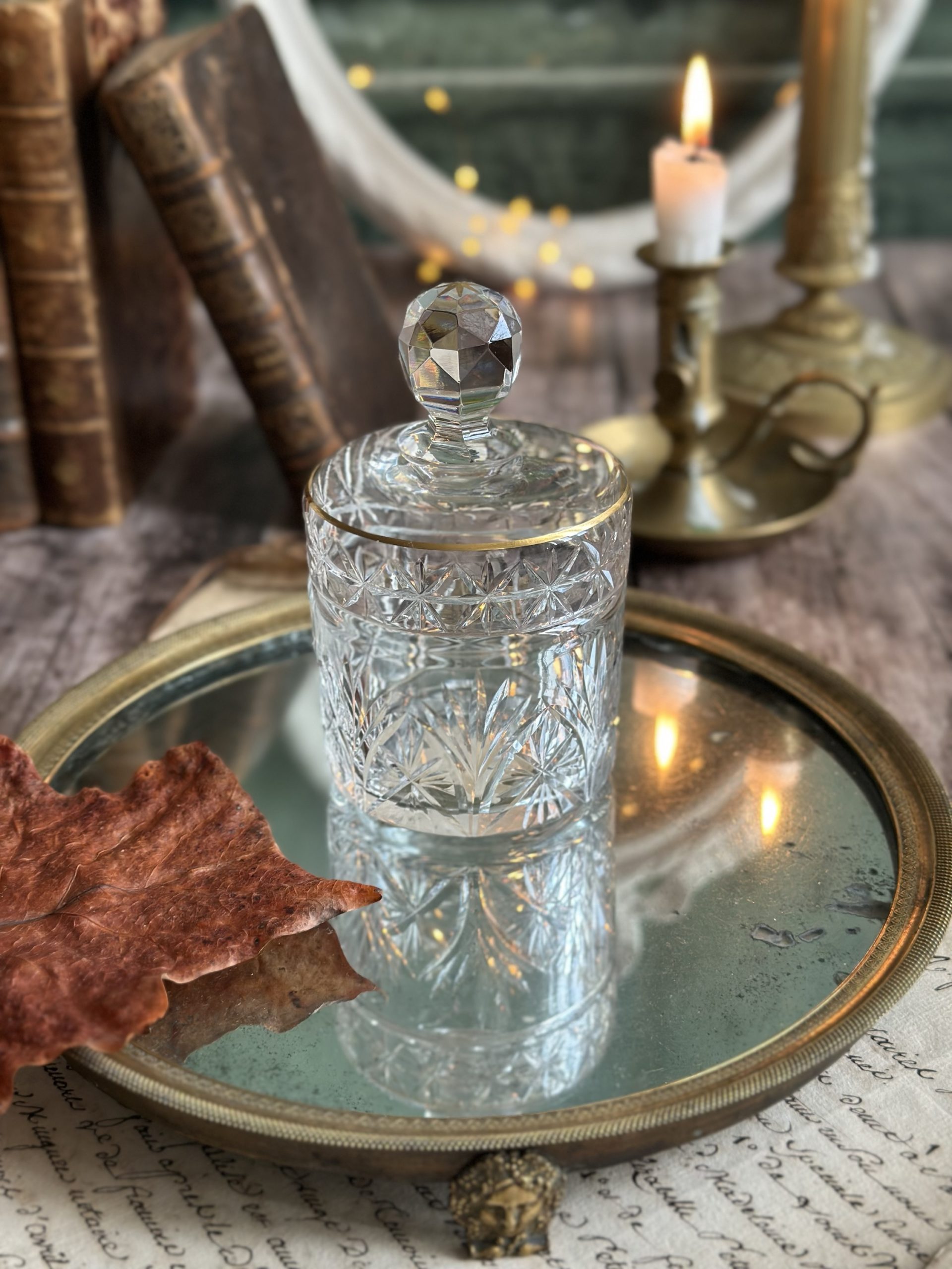 Boite à poudre cristal St Louis pour Galleries Lafayette – datant d’avant 1936 – étiquette originale
