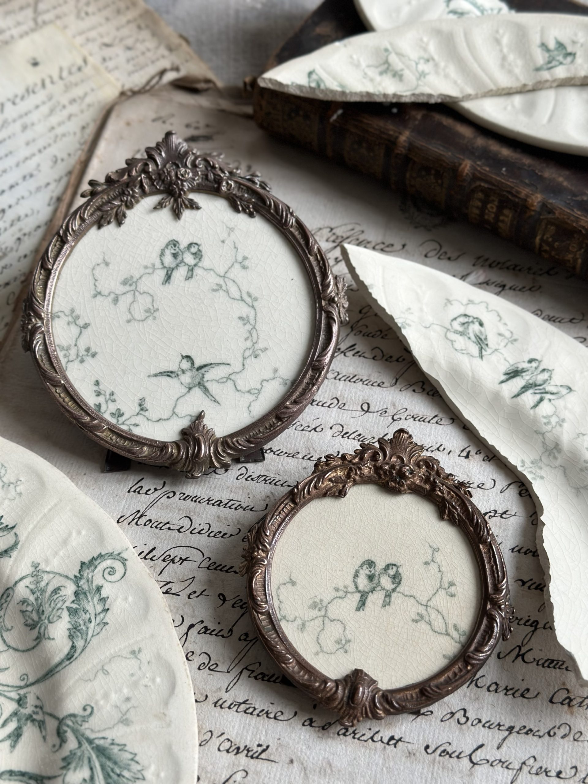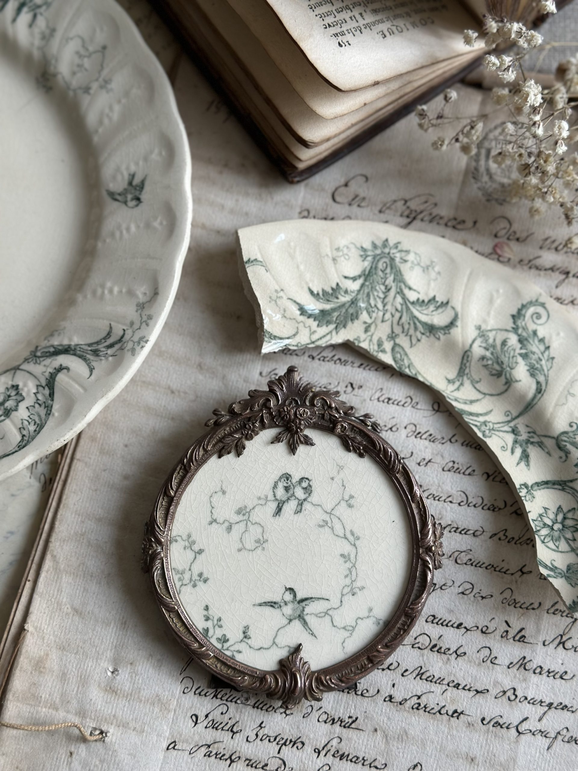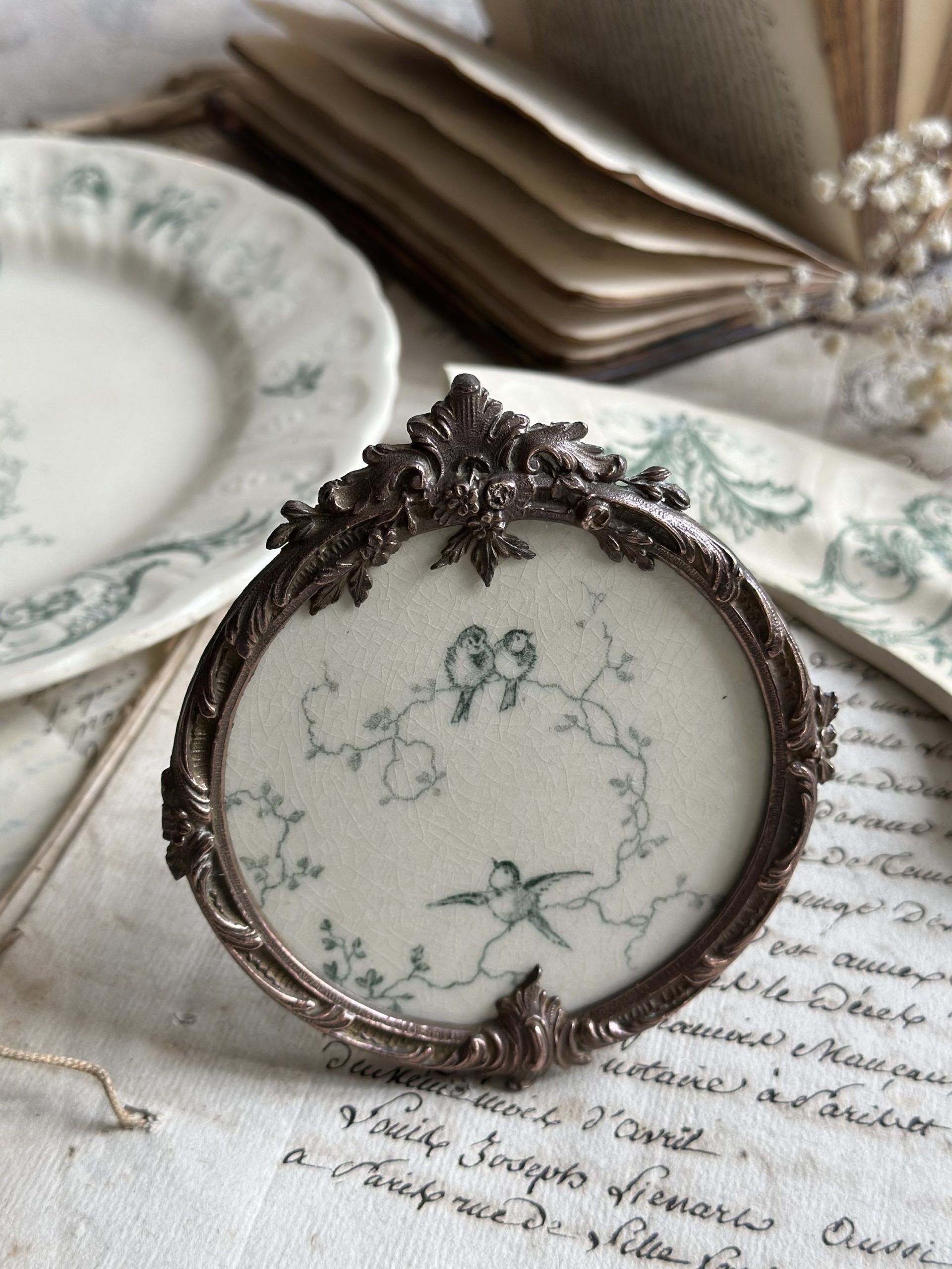 Cadre ancien rond bronze et motif terre de fer Gien Rinceaux