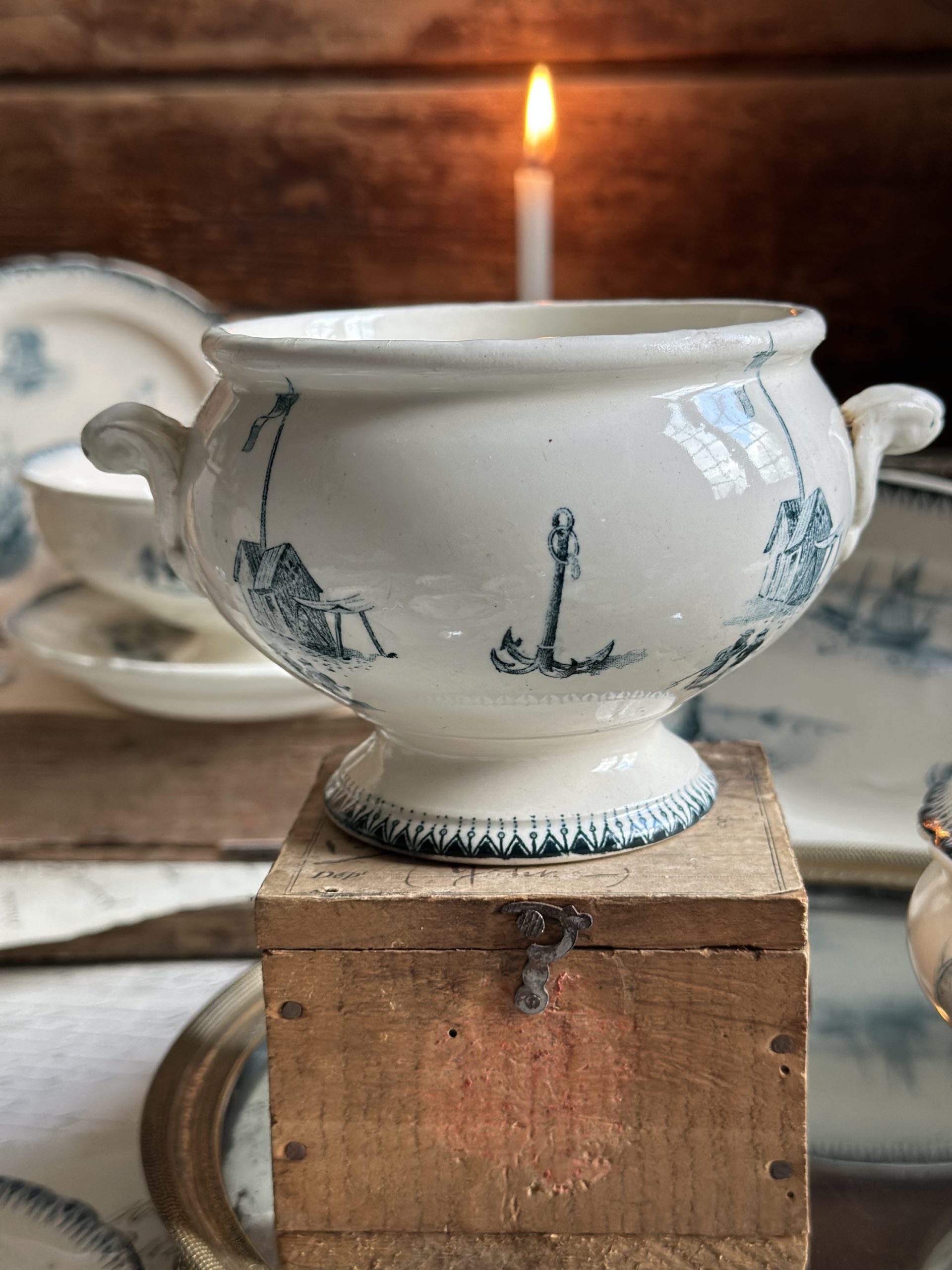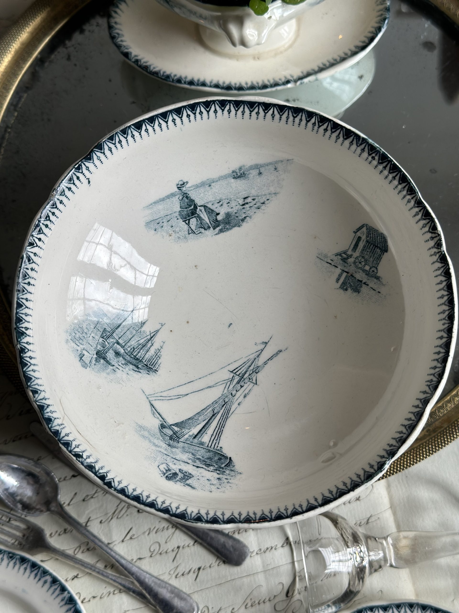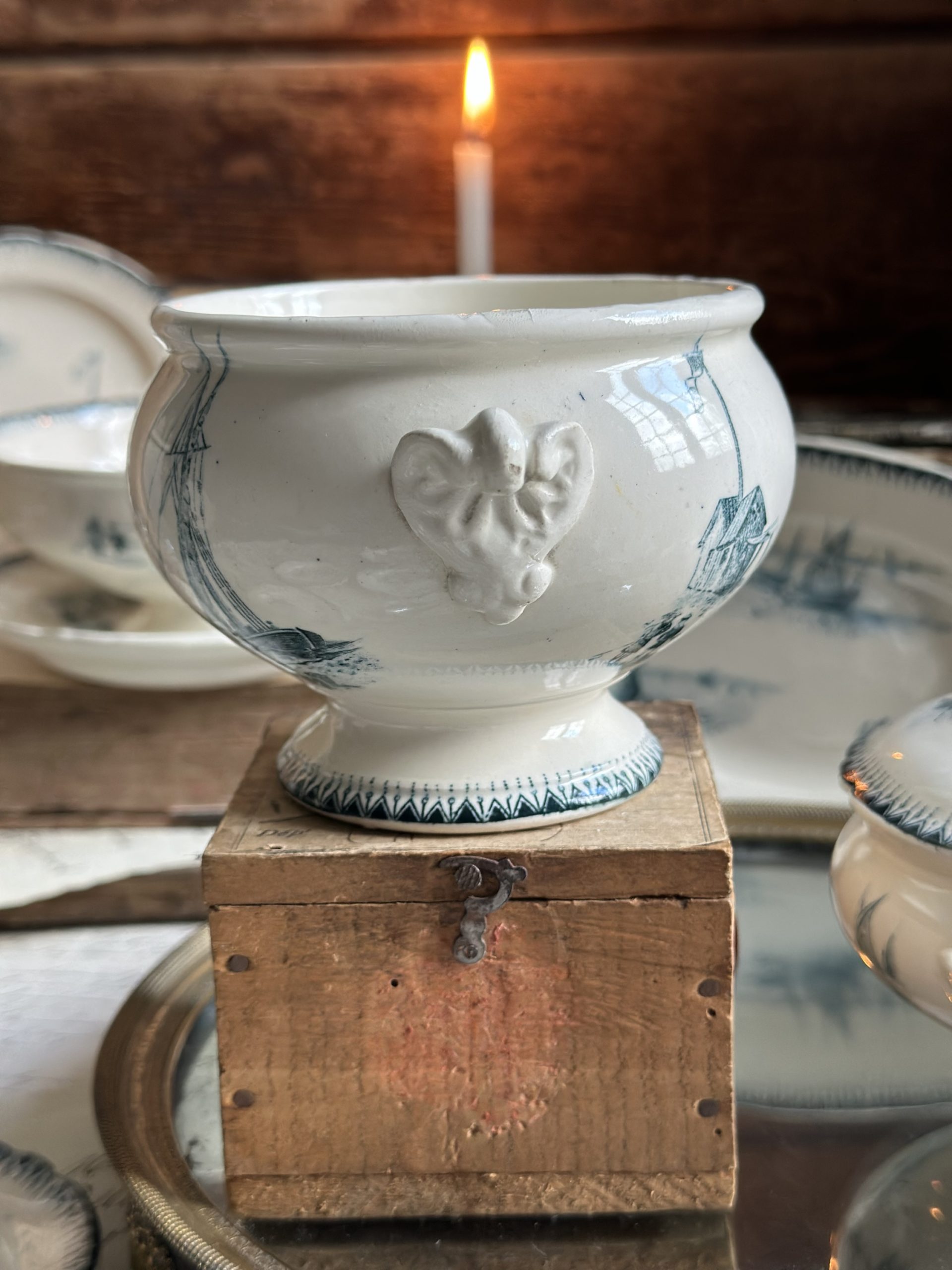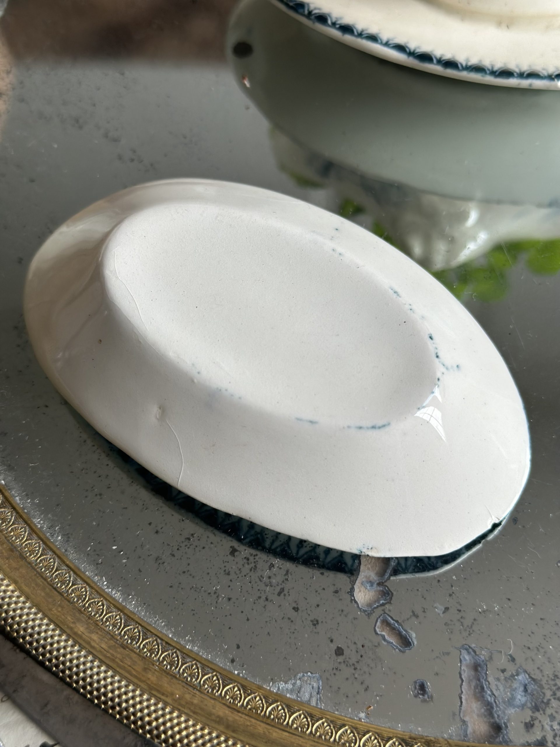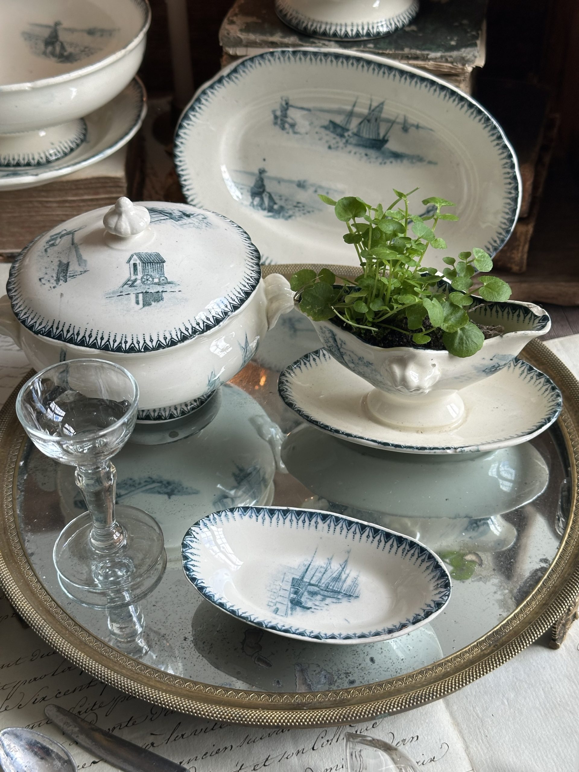 une soupière sans couvercle, un légumier, saladier (égrenure), plat creux 13,50cm , plat rond 13,50cm, plat ovale longueur 16cm, saucière (egrenure) , ravier (une minuscule égrenure au dessous), 10 assiettes 10cm de diamètre (toute petite egrenure sur une)