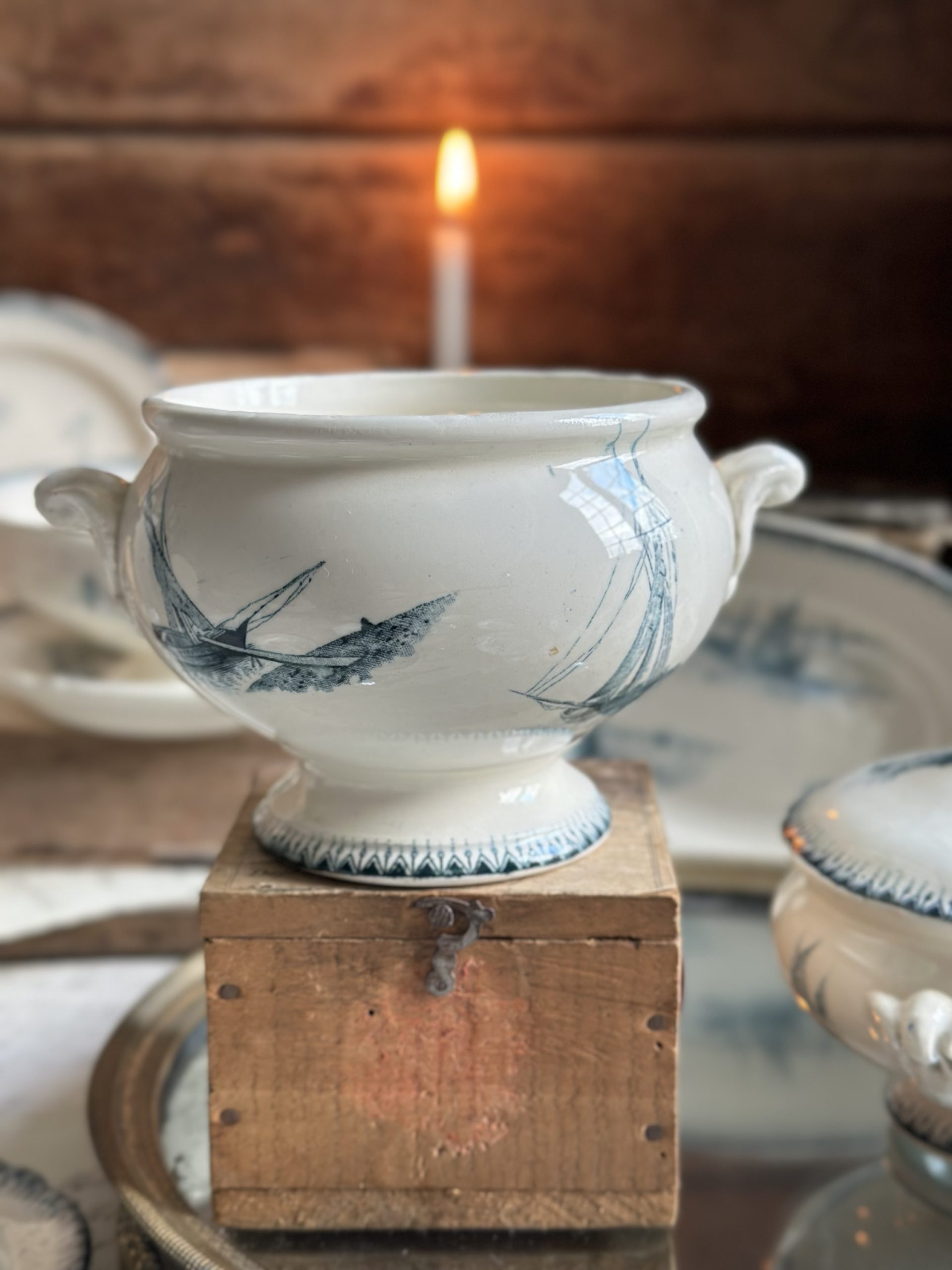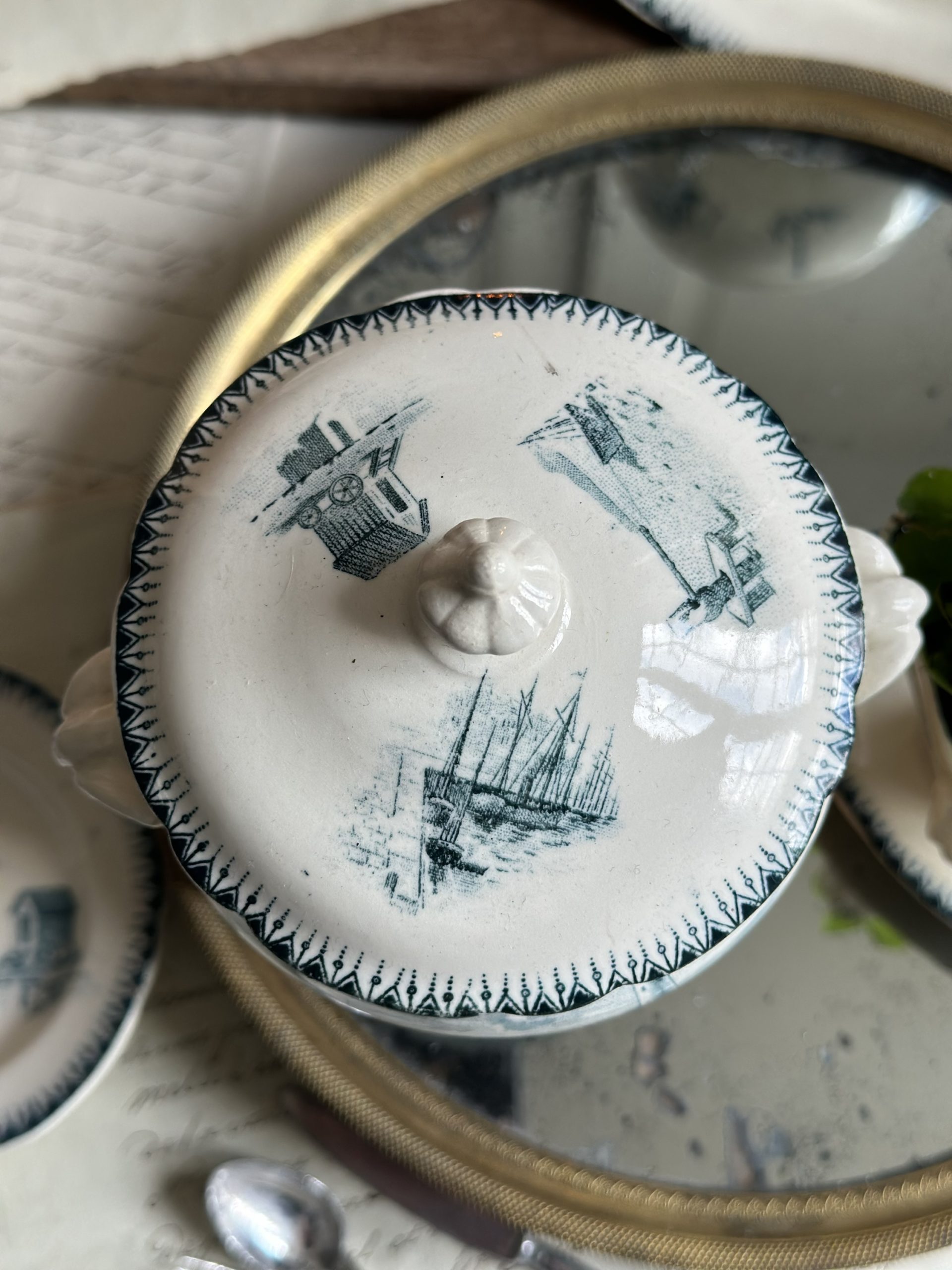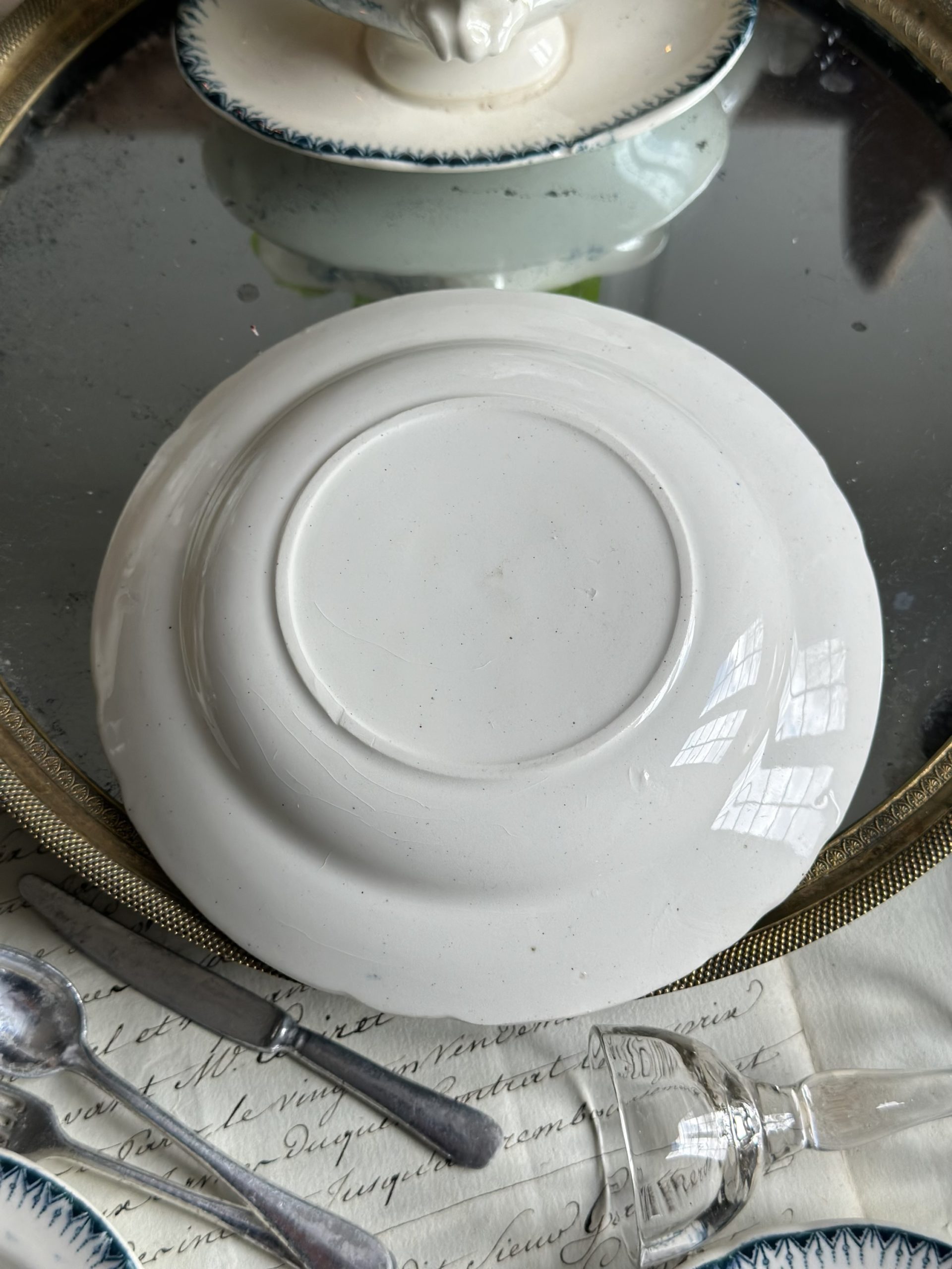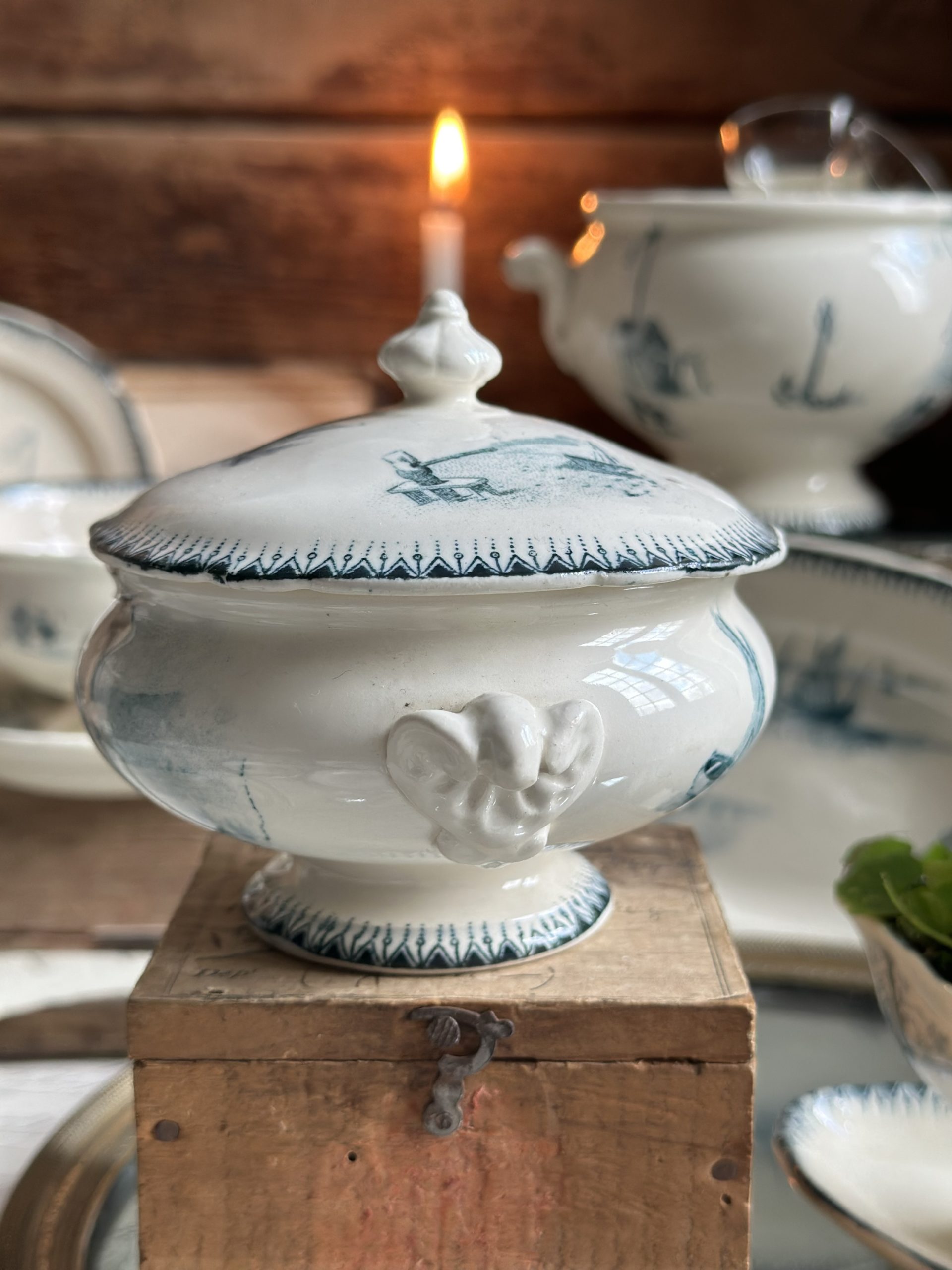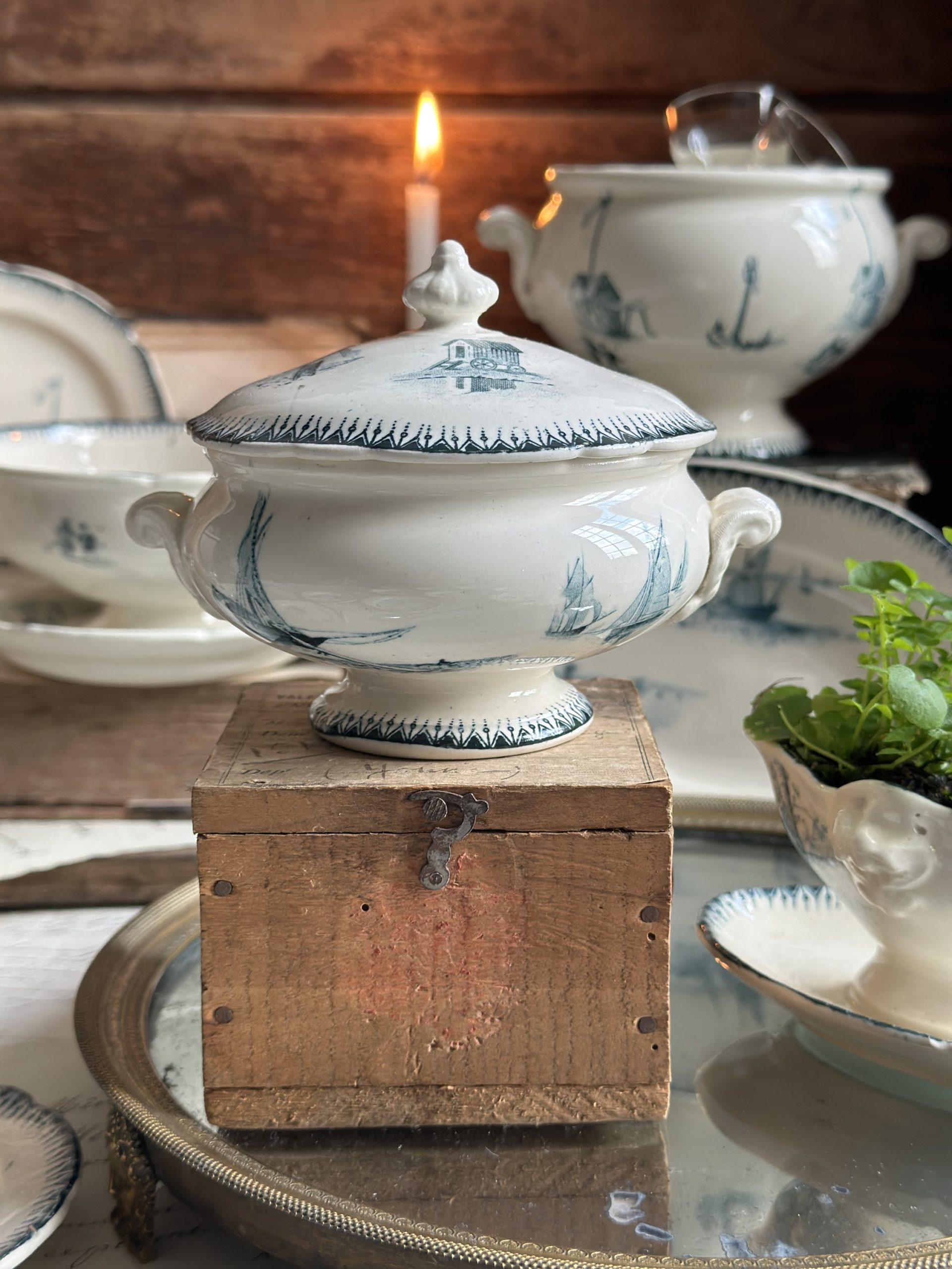 une soupière sans couvercle, un légumier, saladier (égrenure), plat creux 13,50cm , plat rond 13,50cm, plat ovale longueur 16cm, saucière (egrenure) , ravier (une minuscule égrenure au dessous), 10 assiettes 10cm de diamètre (toute petite egrenure sur une)