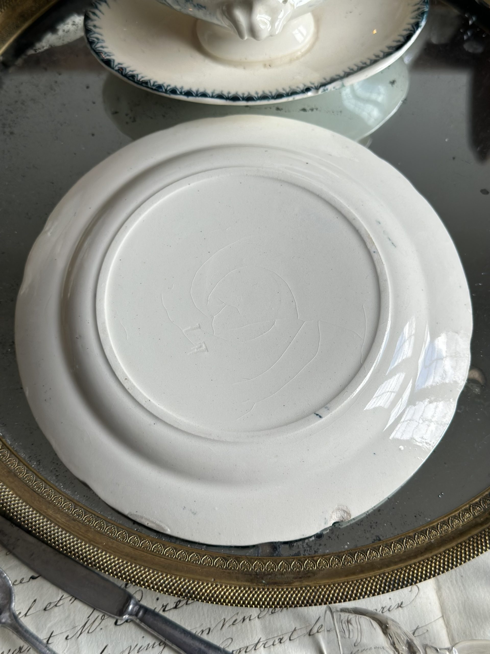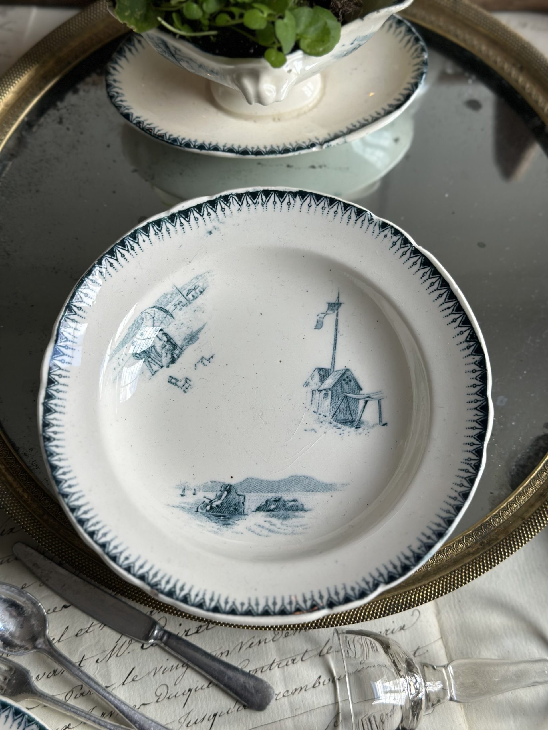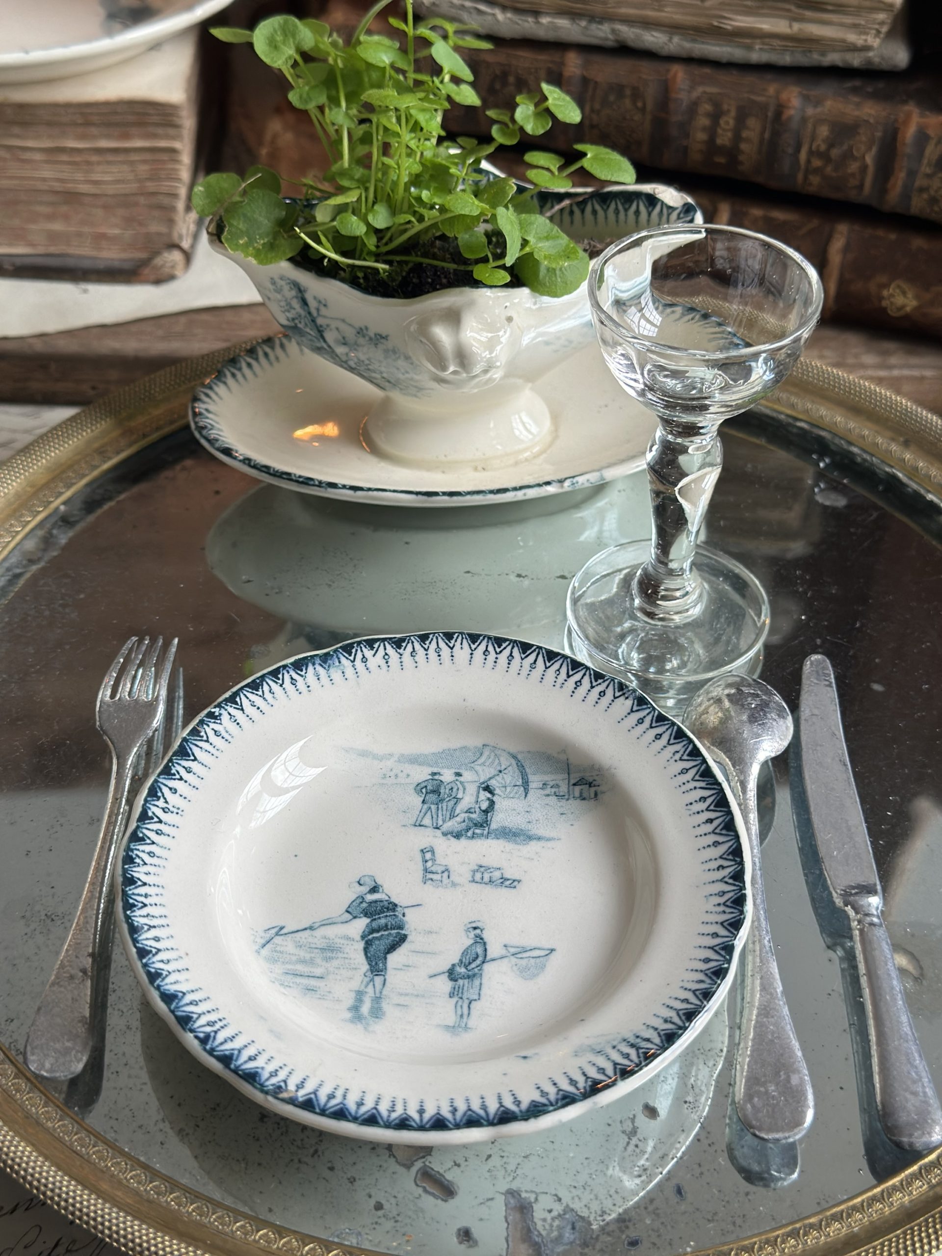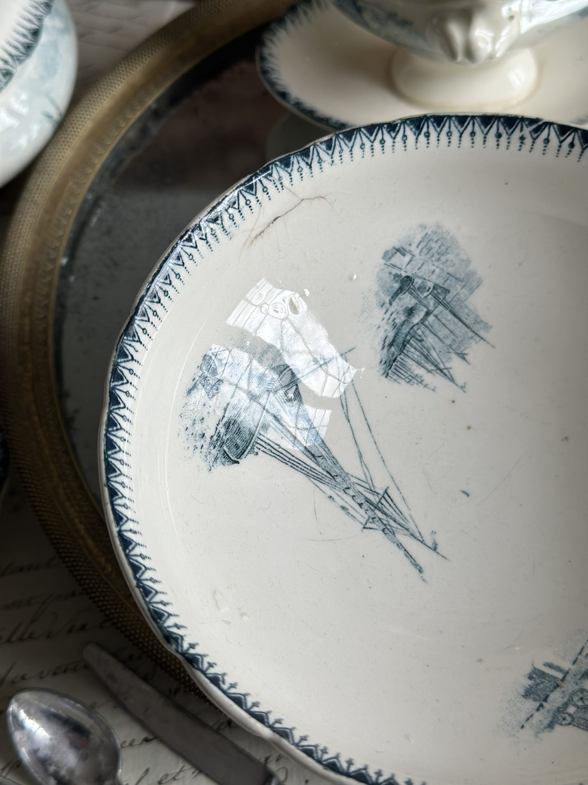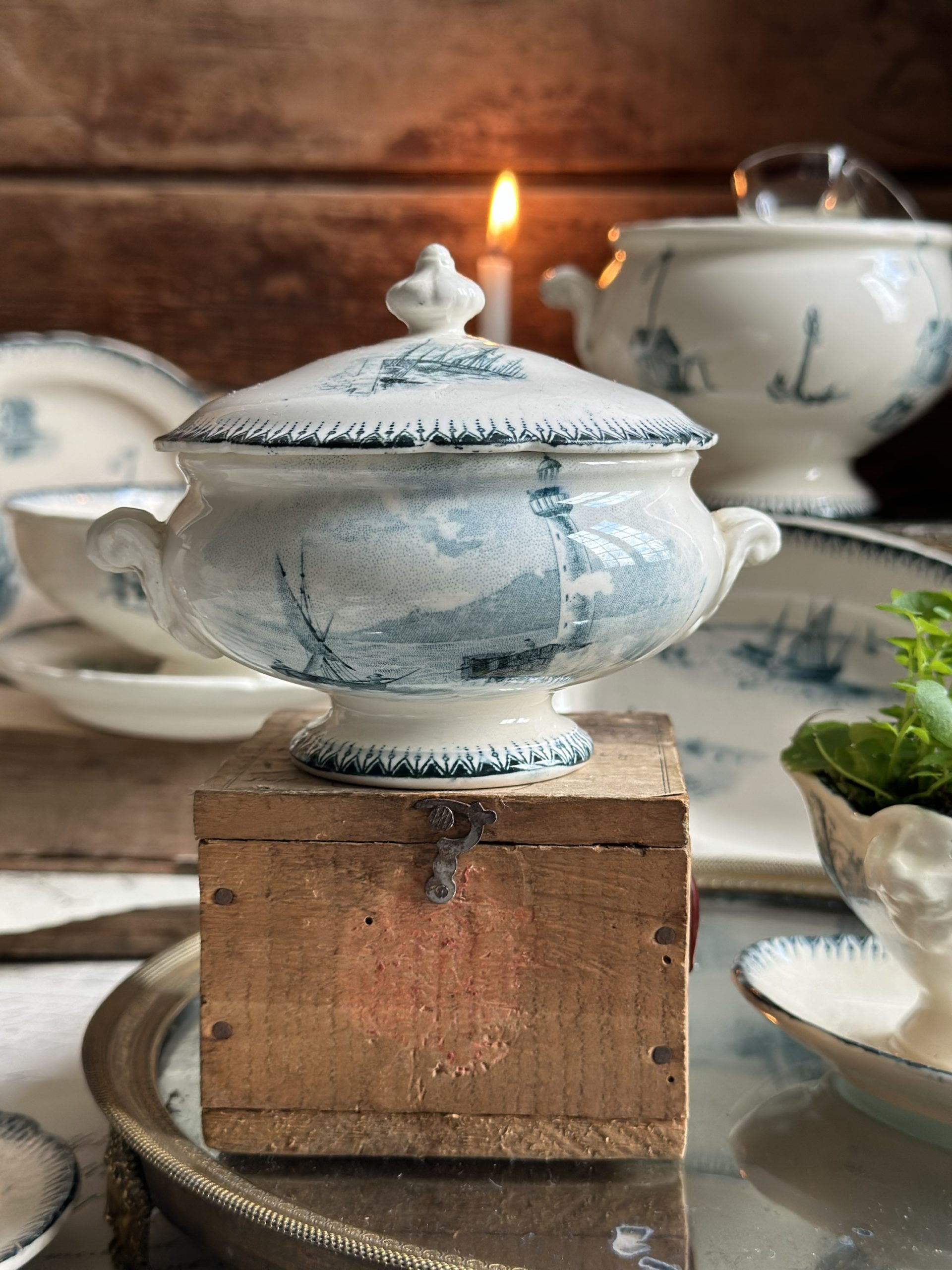 une soupière sans couvercle, un légumier, saladier (égrenure), plat creux 13,50cm , plat rond 13,50cm, plat ovale longueur 16cm, saucière (egrenure) , ravier (une minuscule égrenure au dessous), 10 assiettes 10cm de diamètre (toute petite egrenure sur une)