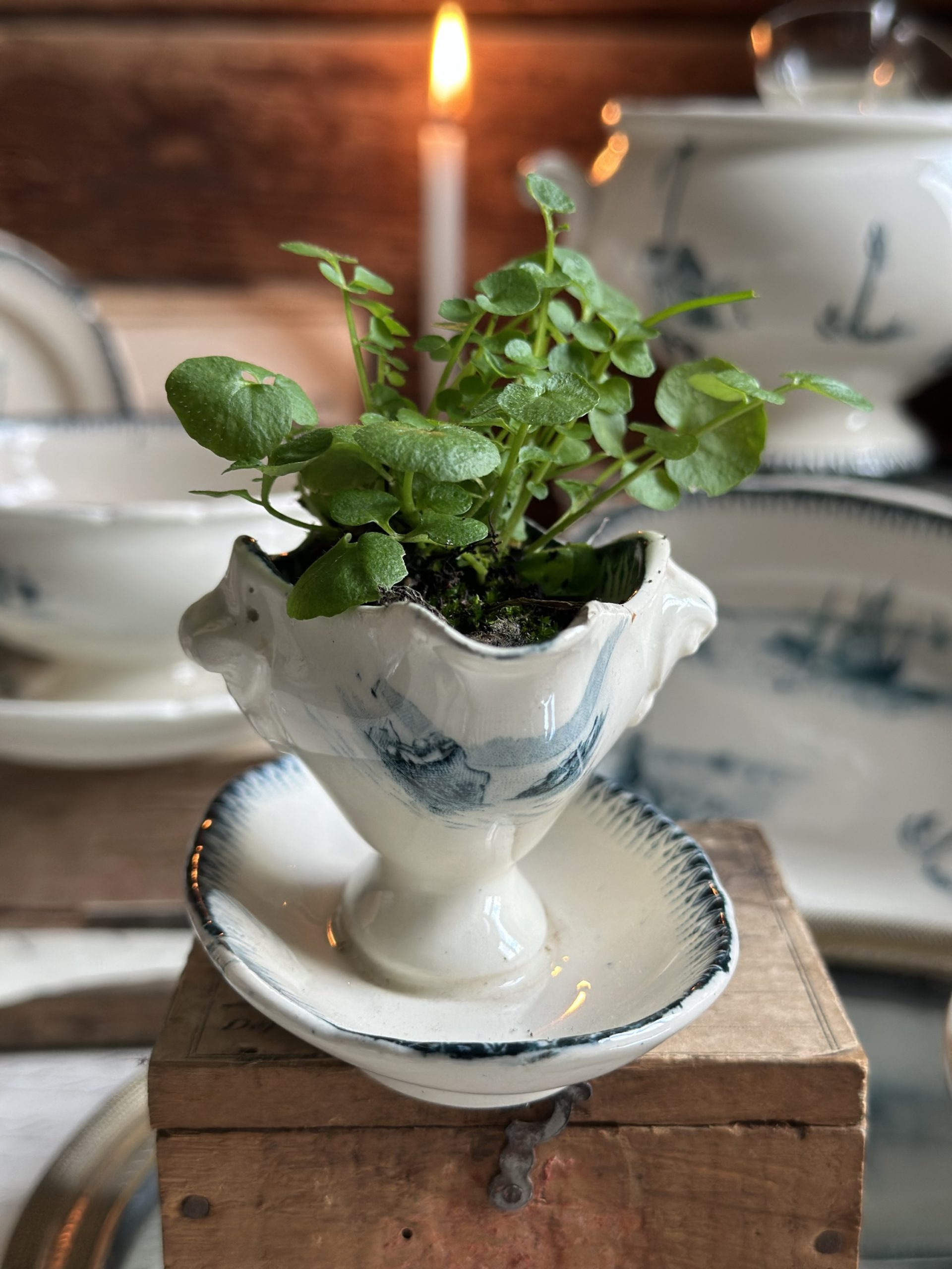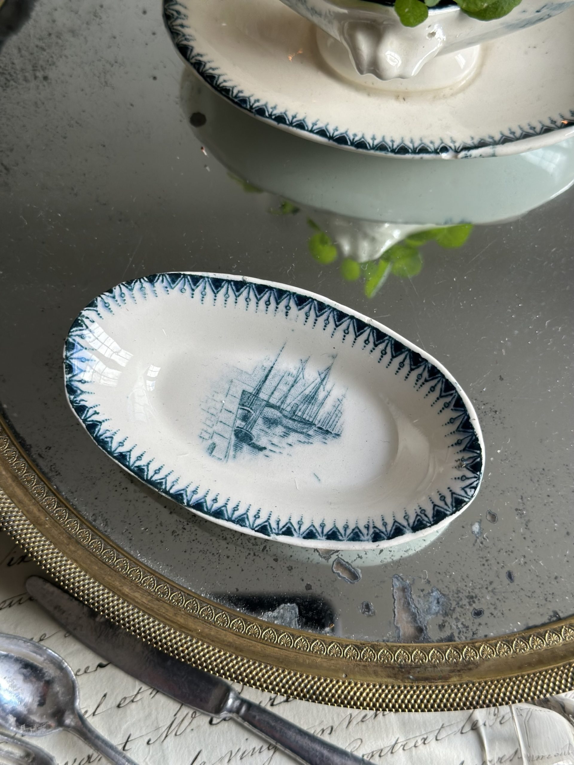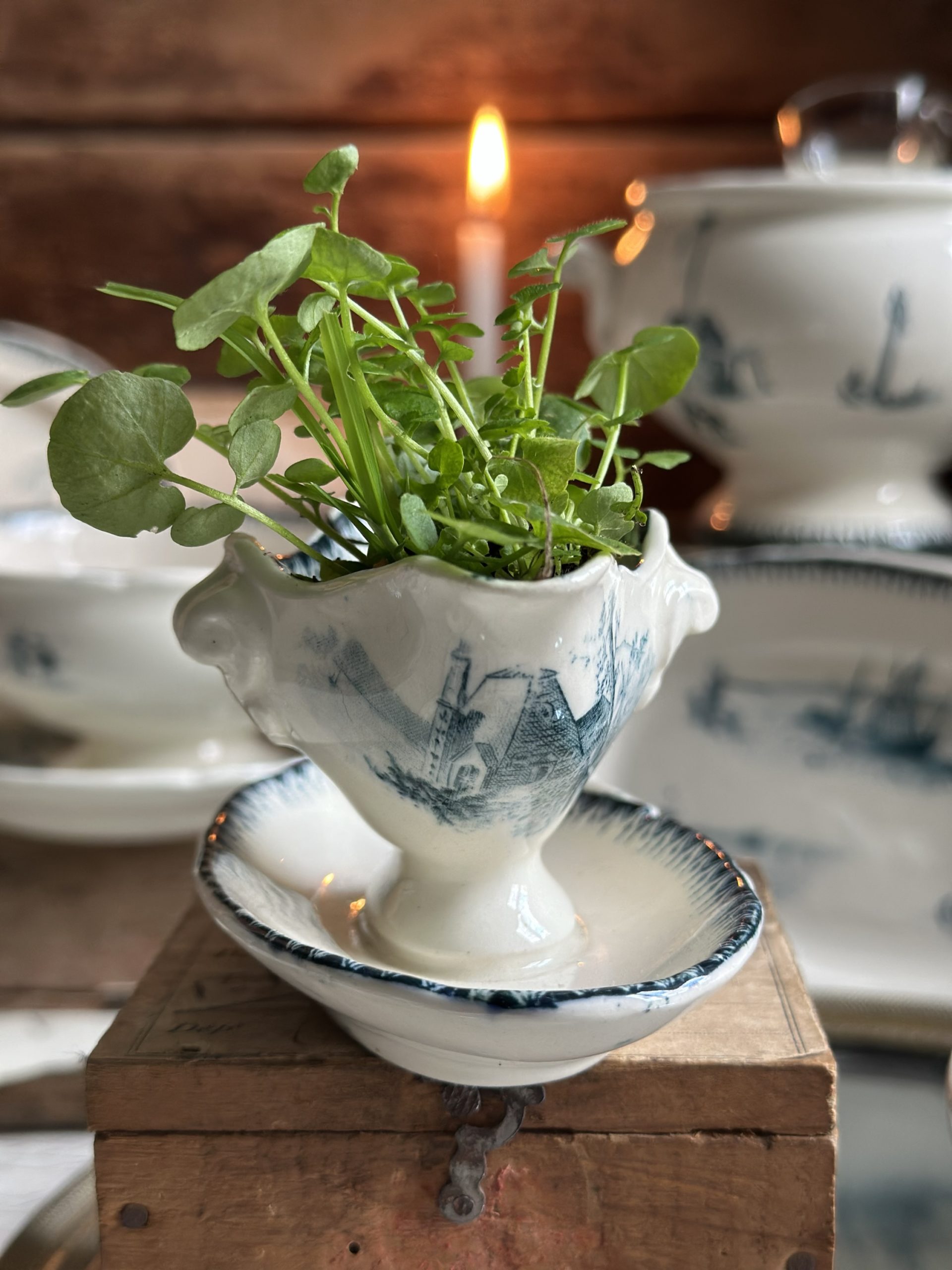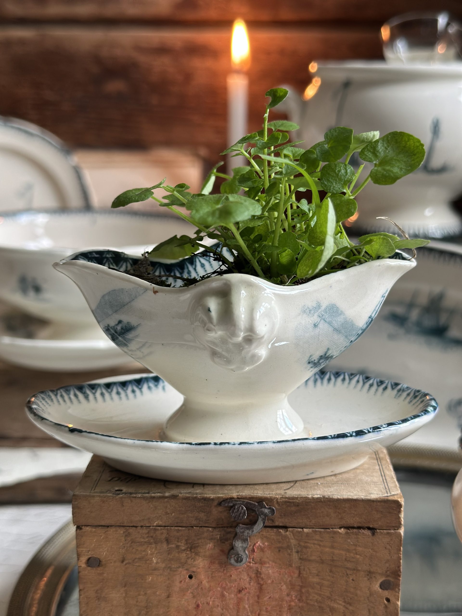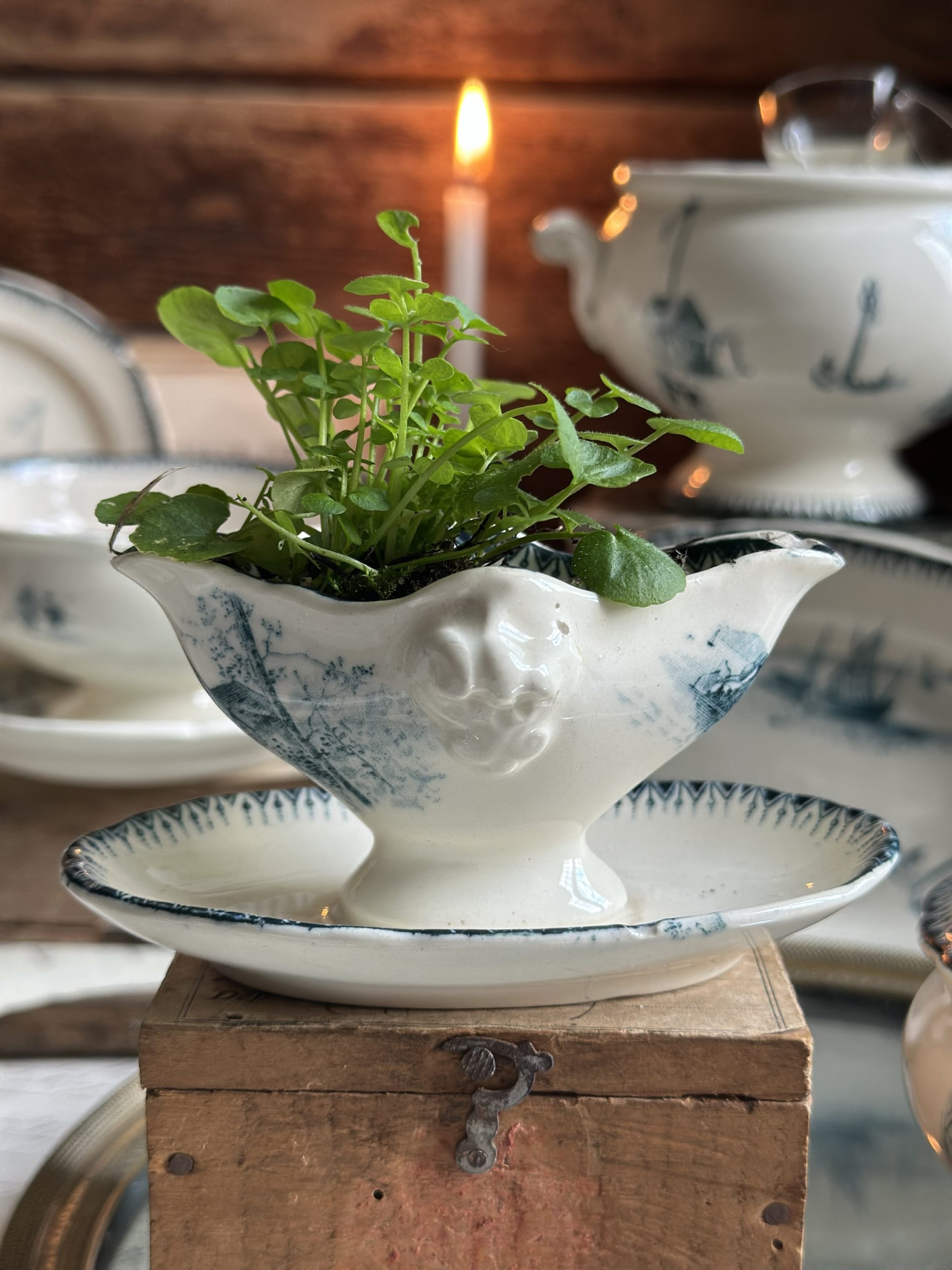 une soupière sans couvercle, un légumier, saladier (égrenure), plat creux 13,50cm , plat rond 13,50cm, plat ovale longueur 16cm, saucière (egrenure) , ravier (une minuscule égrenure au dessous), 10 assiettes 10cm de diamètre (toute petite egrenure sur une)