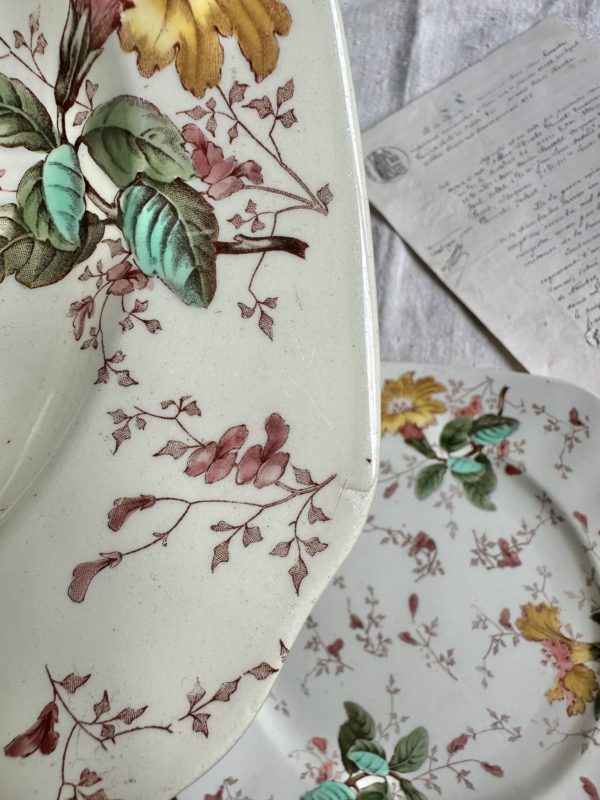 Une assiette plate en très bon état et une assiettes creuse en bel état (petite égrenure sur l’émail – voir photo)