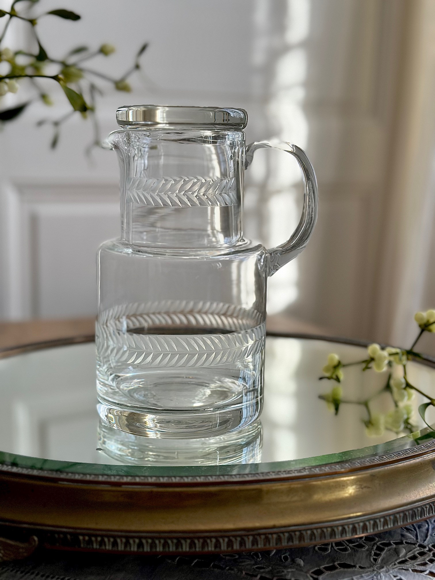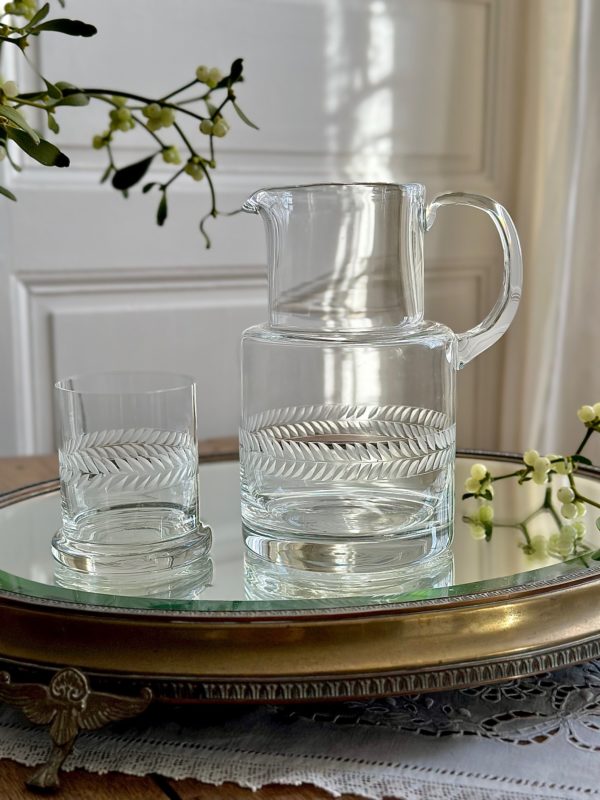 Elégant service / set de nuit avec la carafe et son verre, en verre ciselé