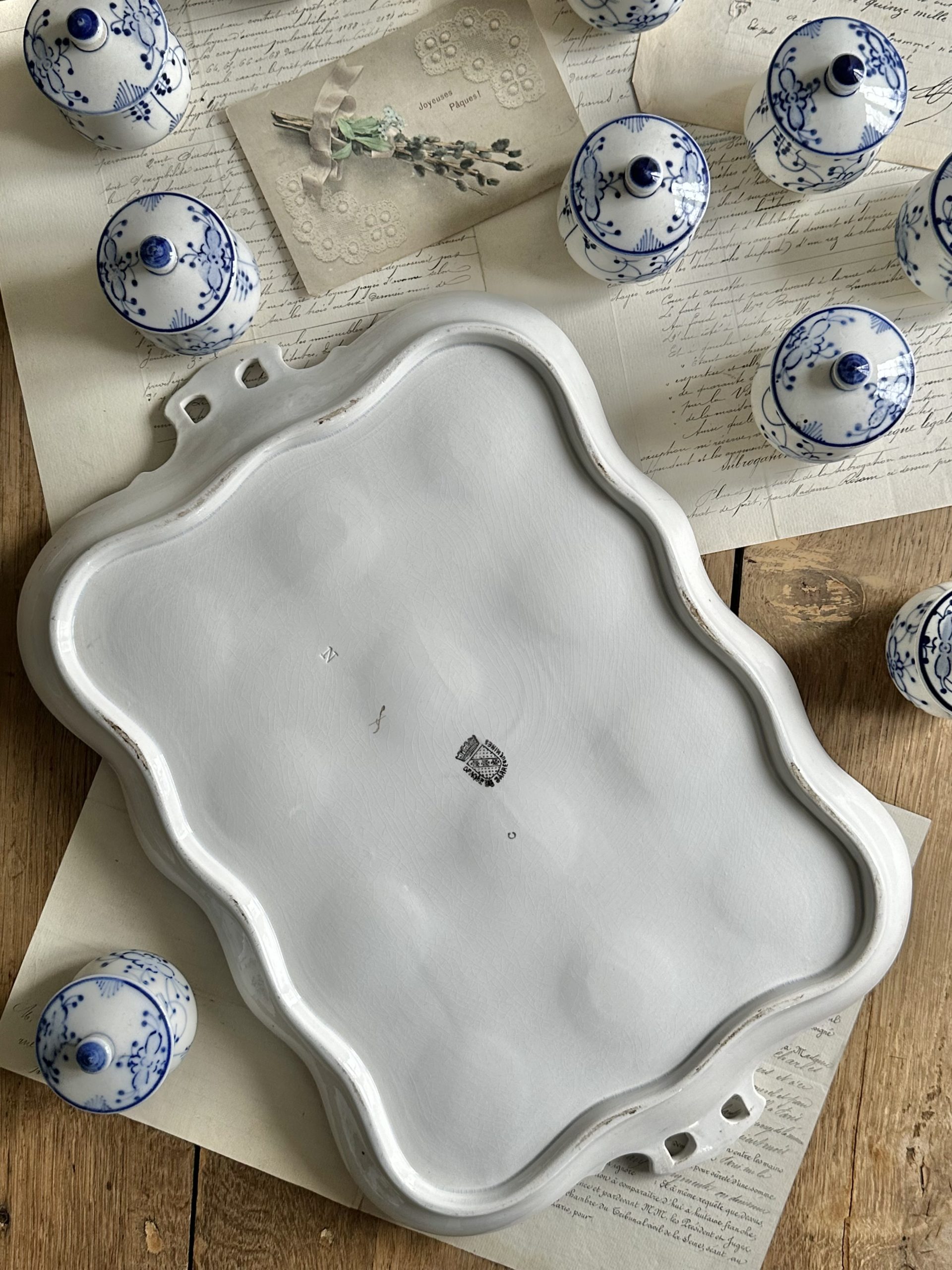 Exceptionnel ensemble de 12 pots à crème et leur plateau de la manufacture Sarreguemines fin XIXème / tout début XXème