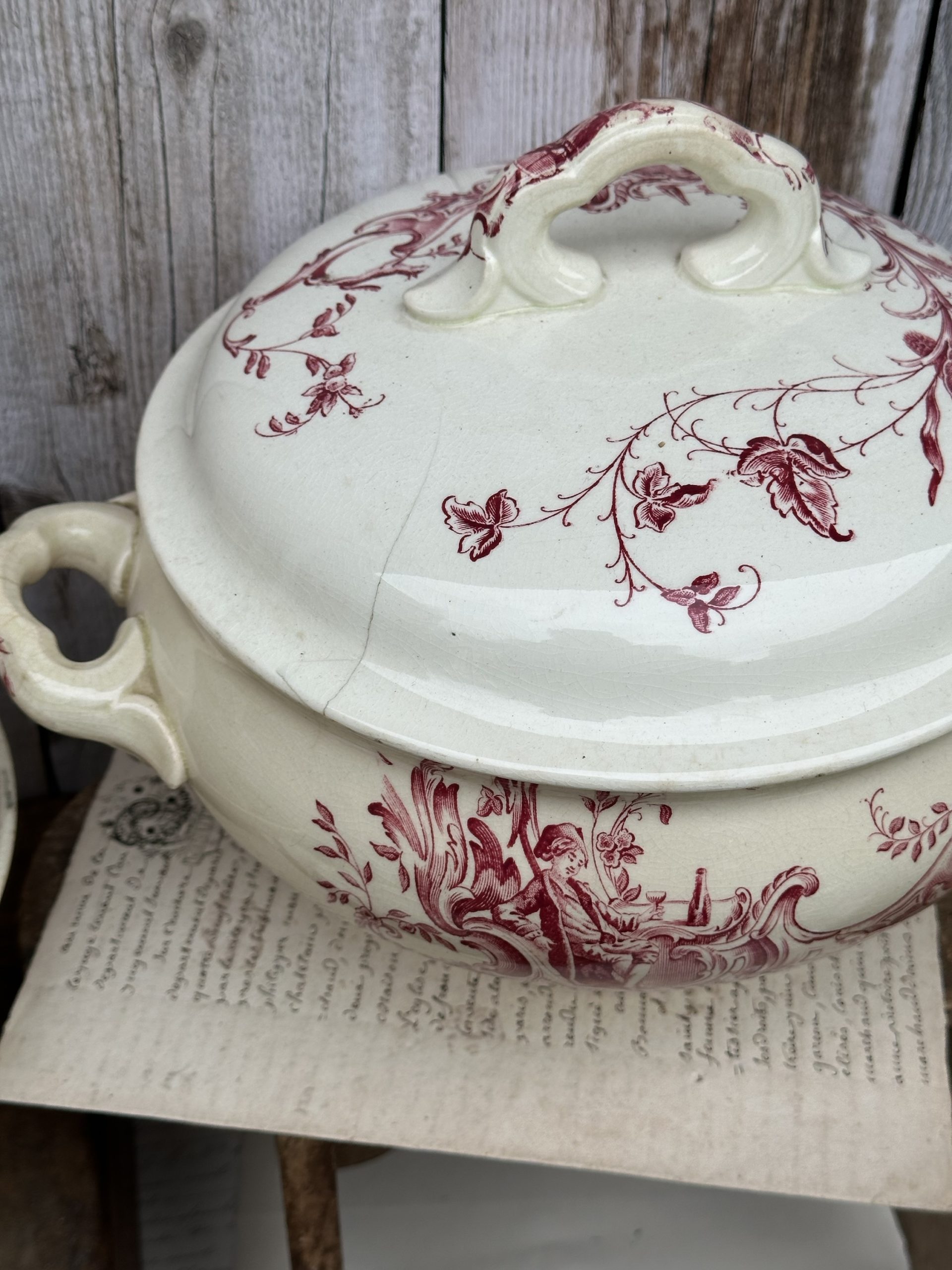 au total: 6 assiettes plates 6 assiettes creuses, 6 assiettes à dessert grand compotier avec éclat, soupière avec couvercle fêlé, sucrier