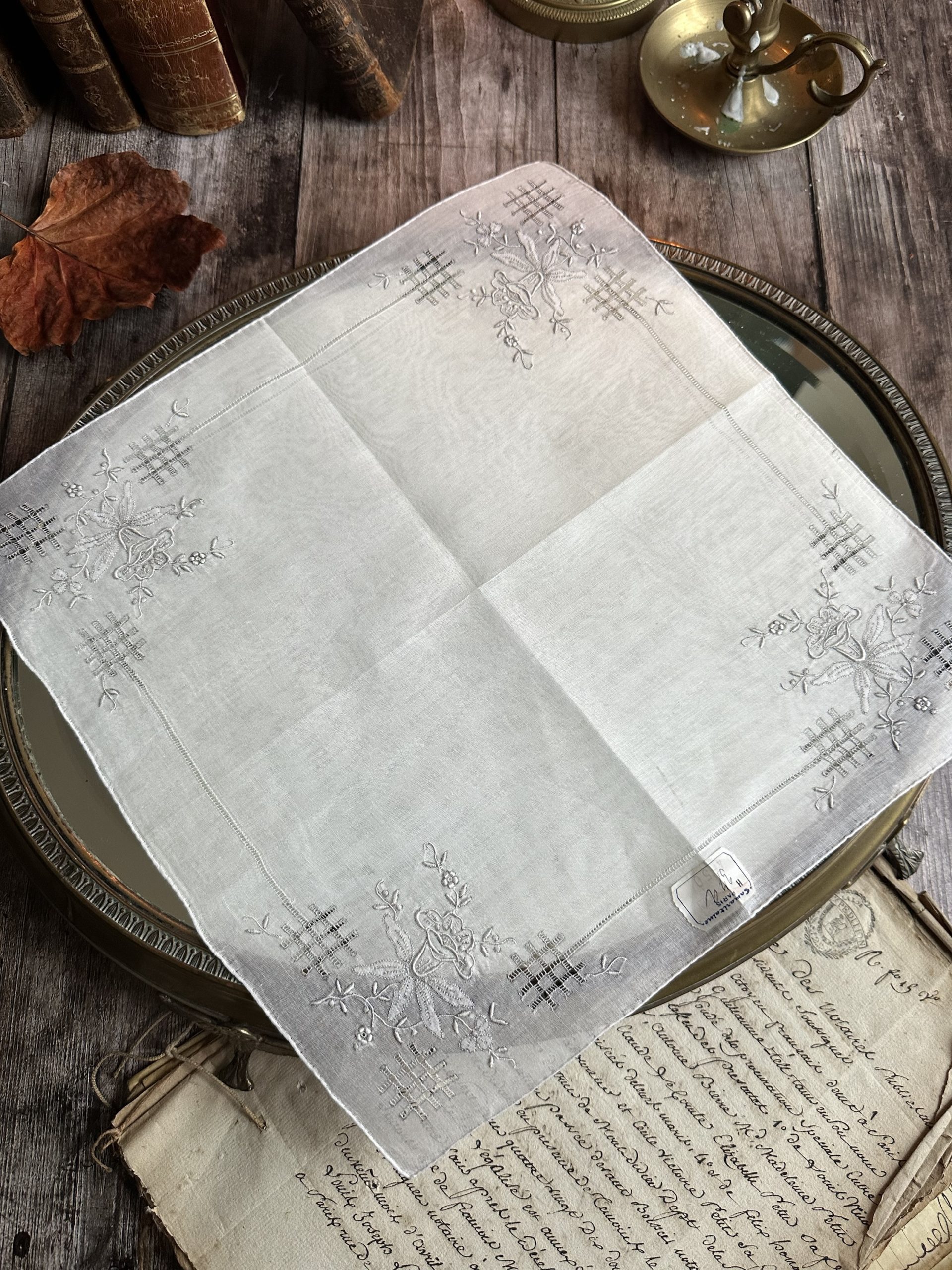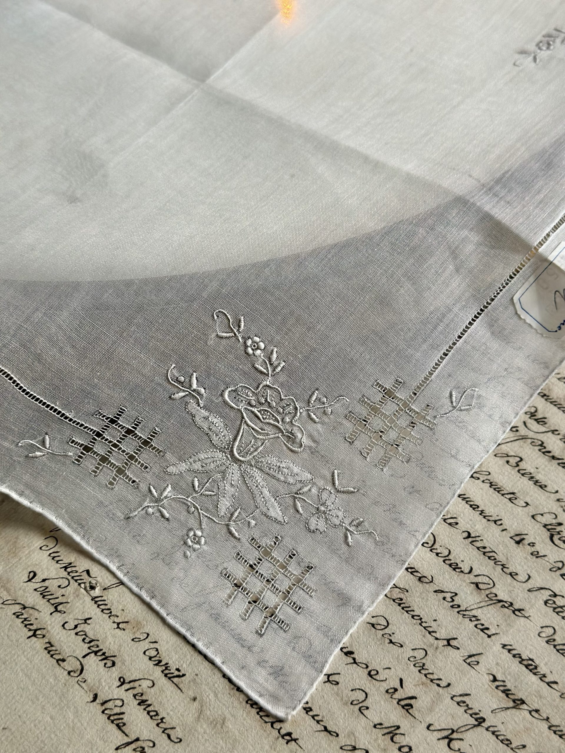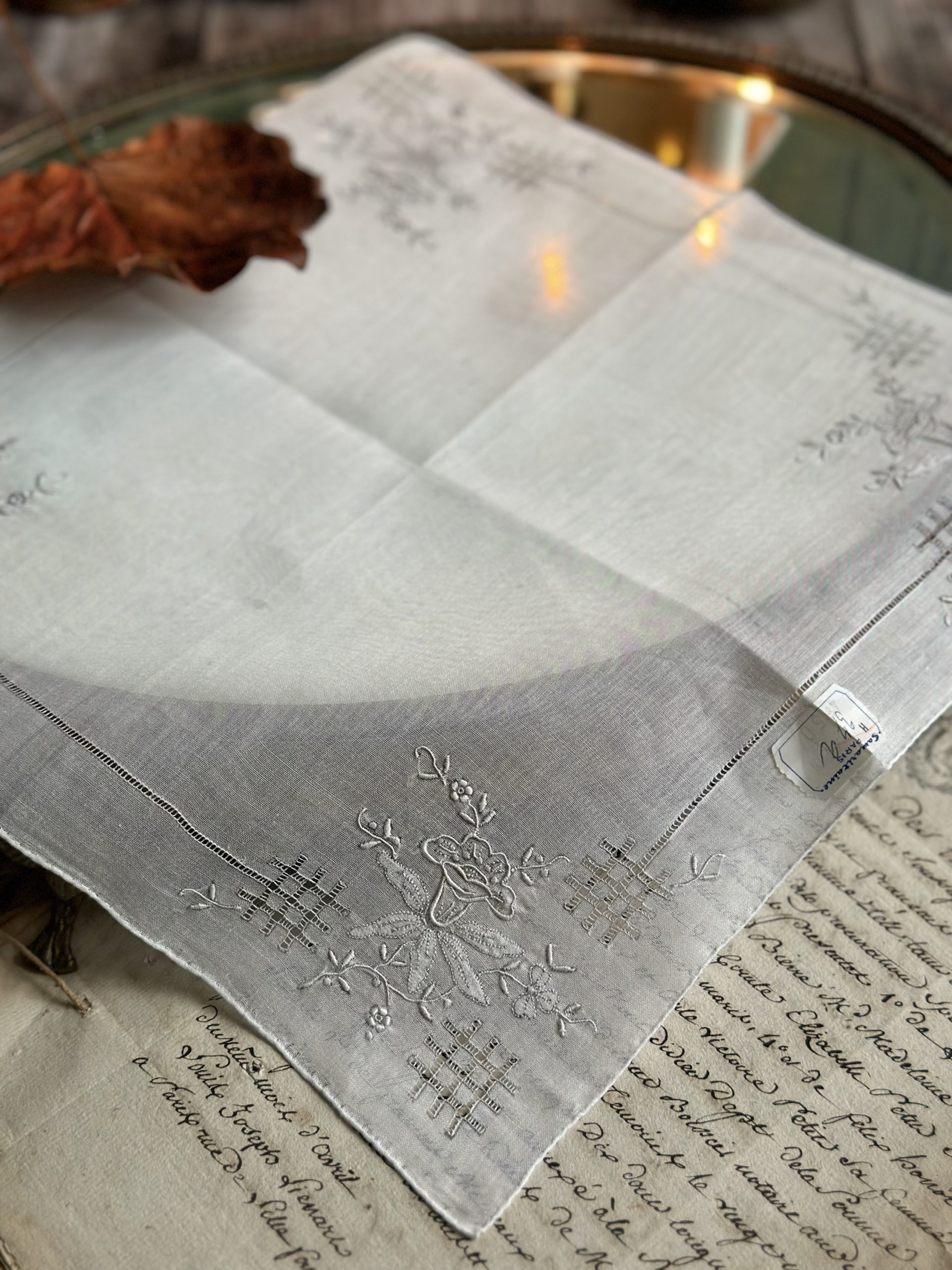 IV. Mouchoir ancien brodé main – étiqueté Samaritaine Paris