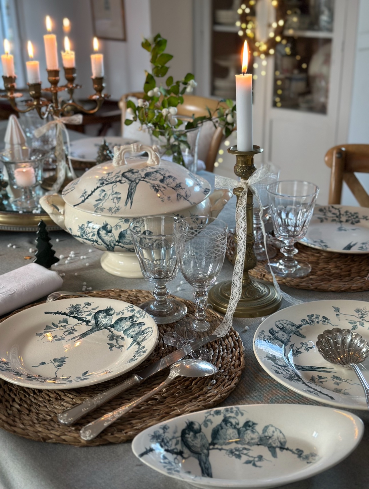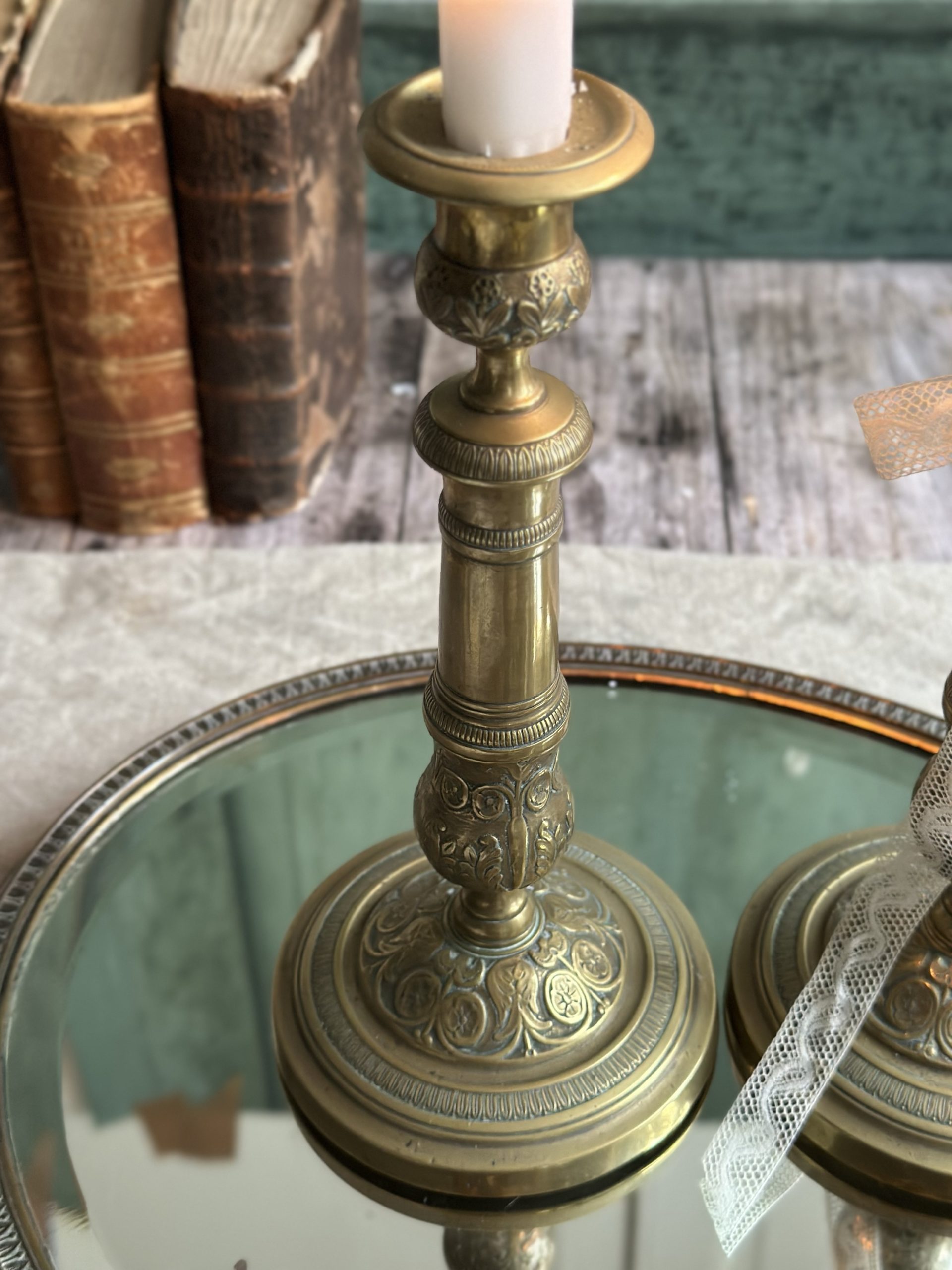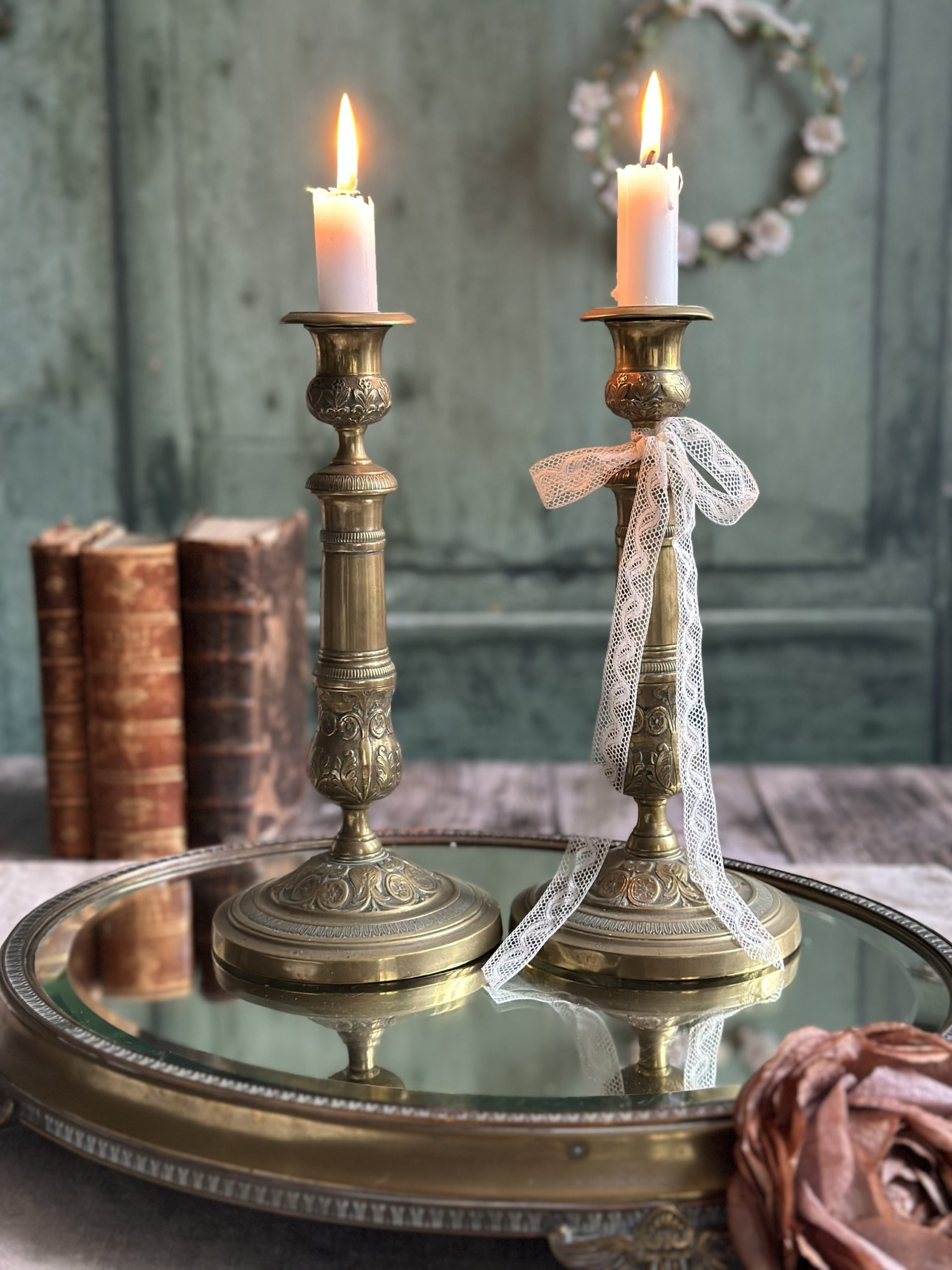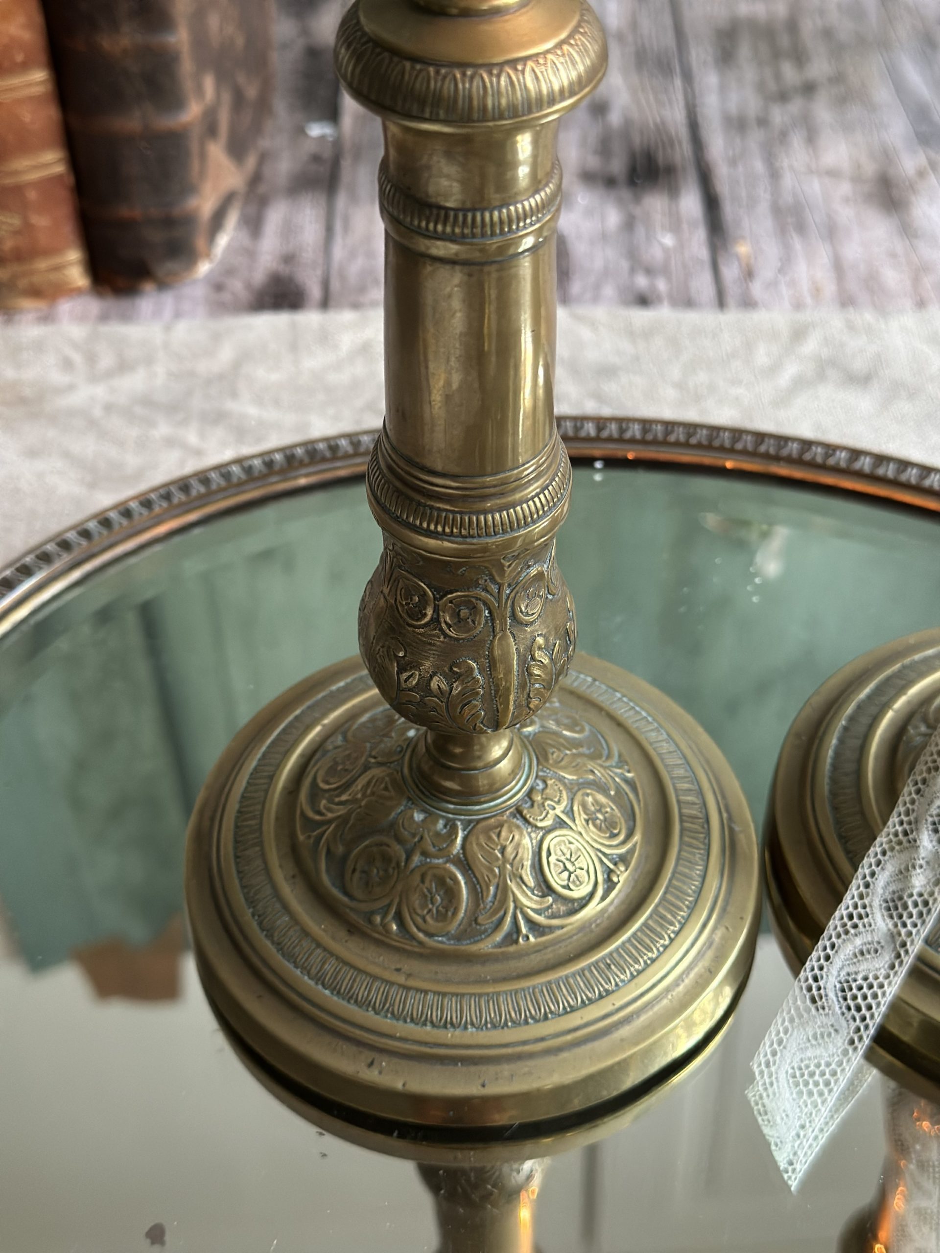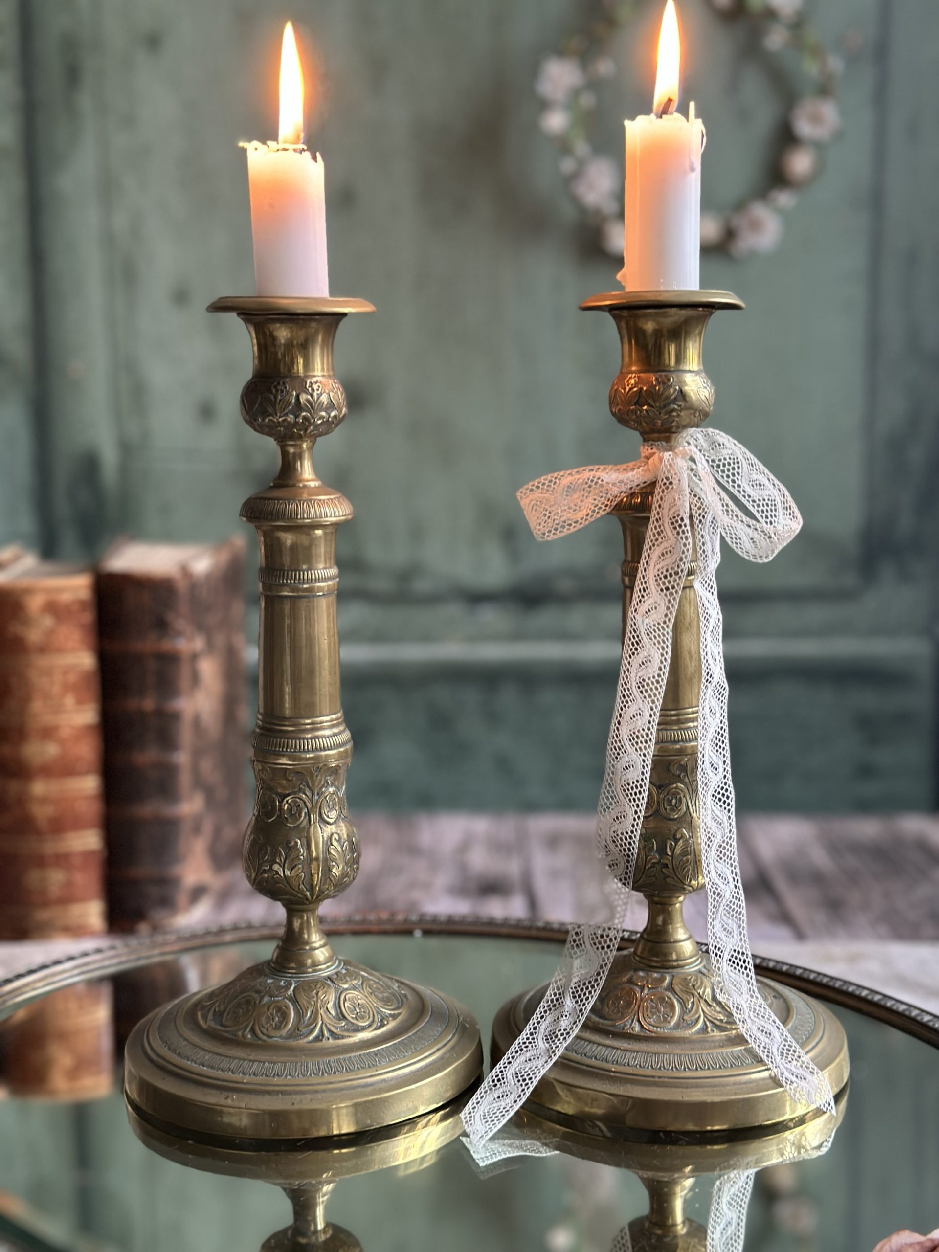 Paire de grands bougeoirs anciens à motifs fleuris