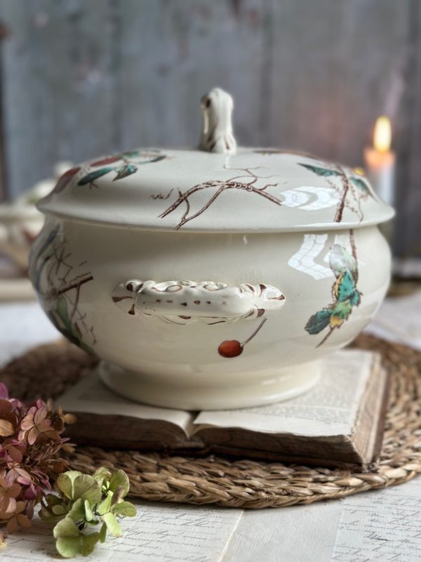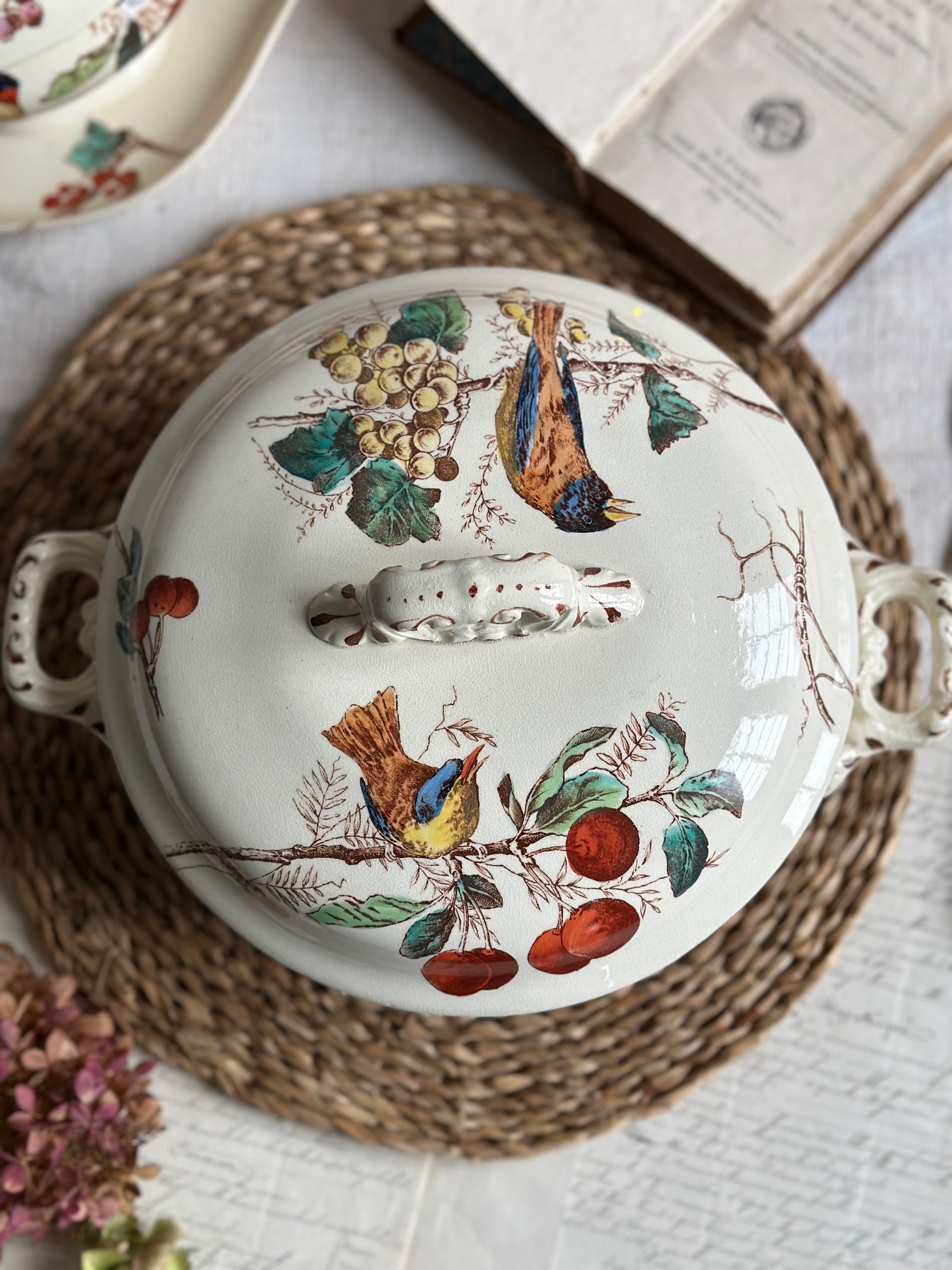 Soupière terre de fer polychrome Choisy le Roi, oiseaux