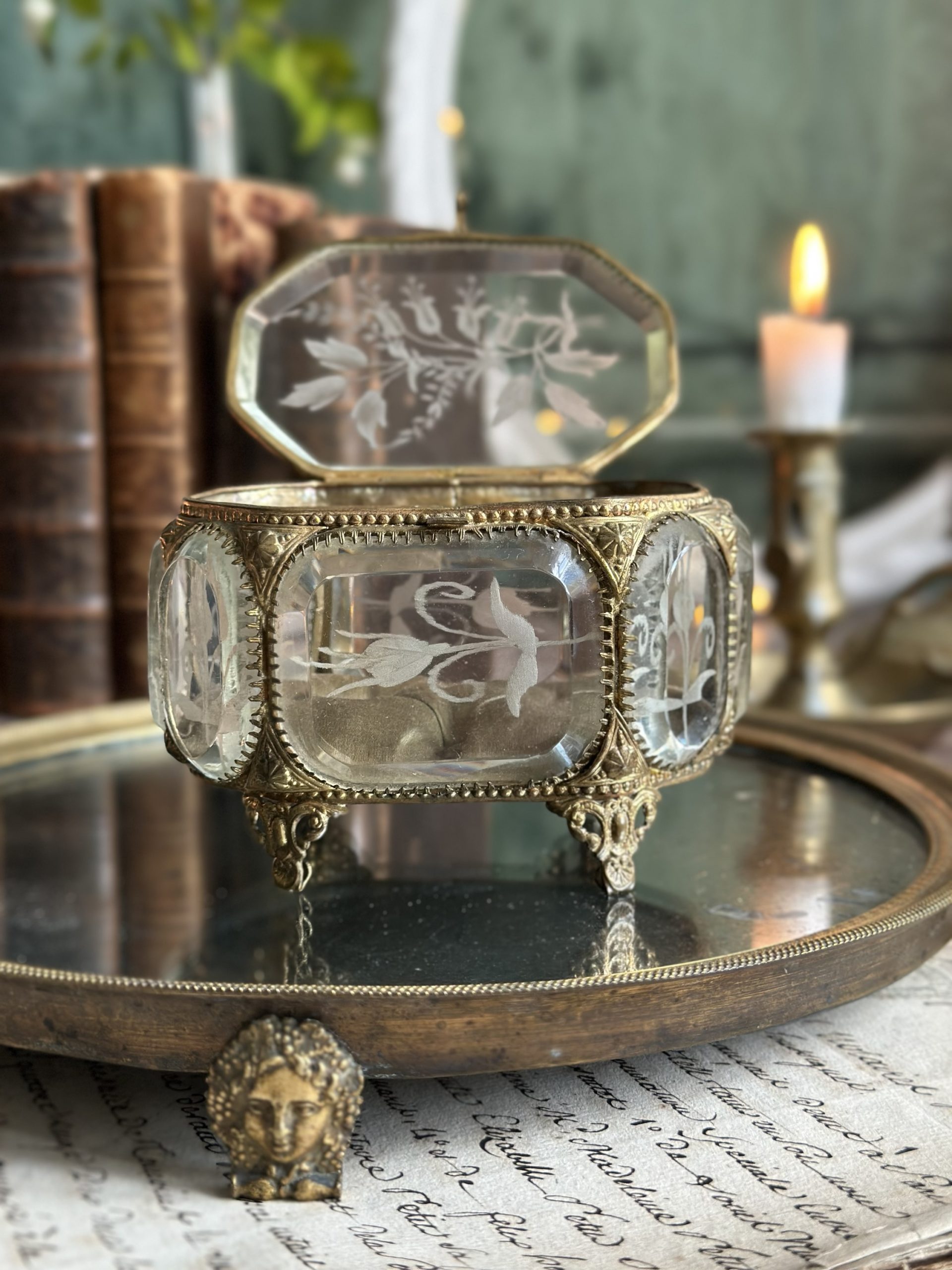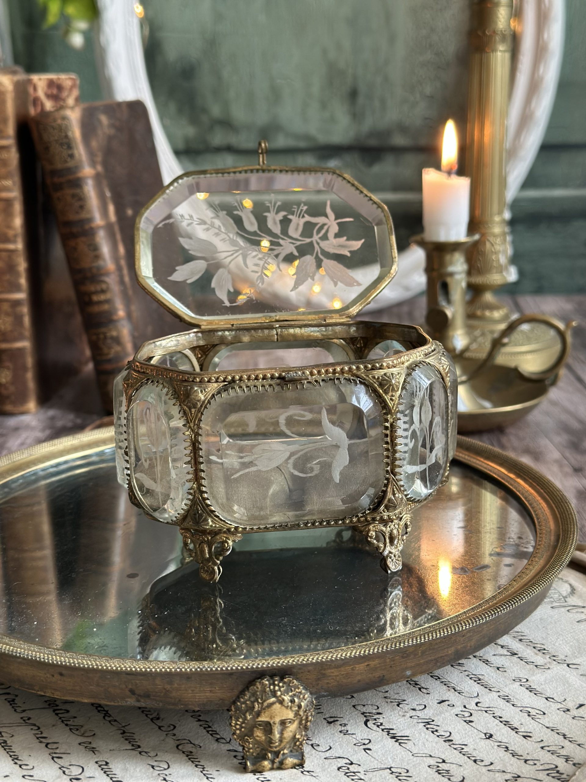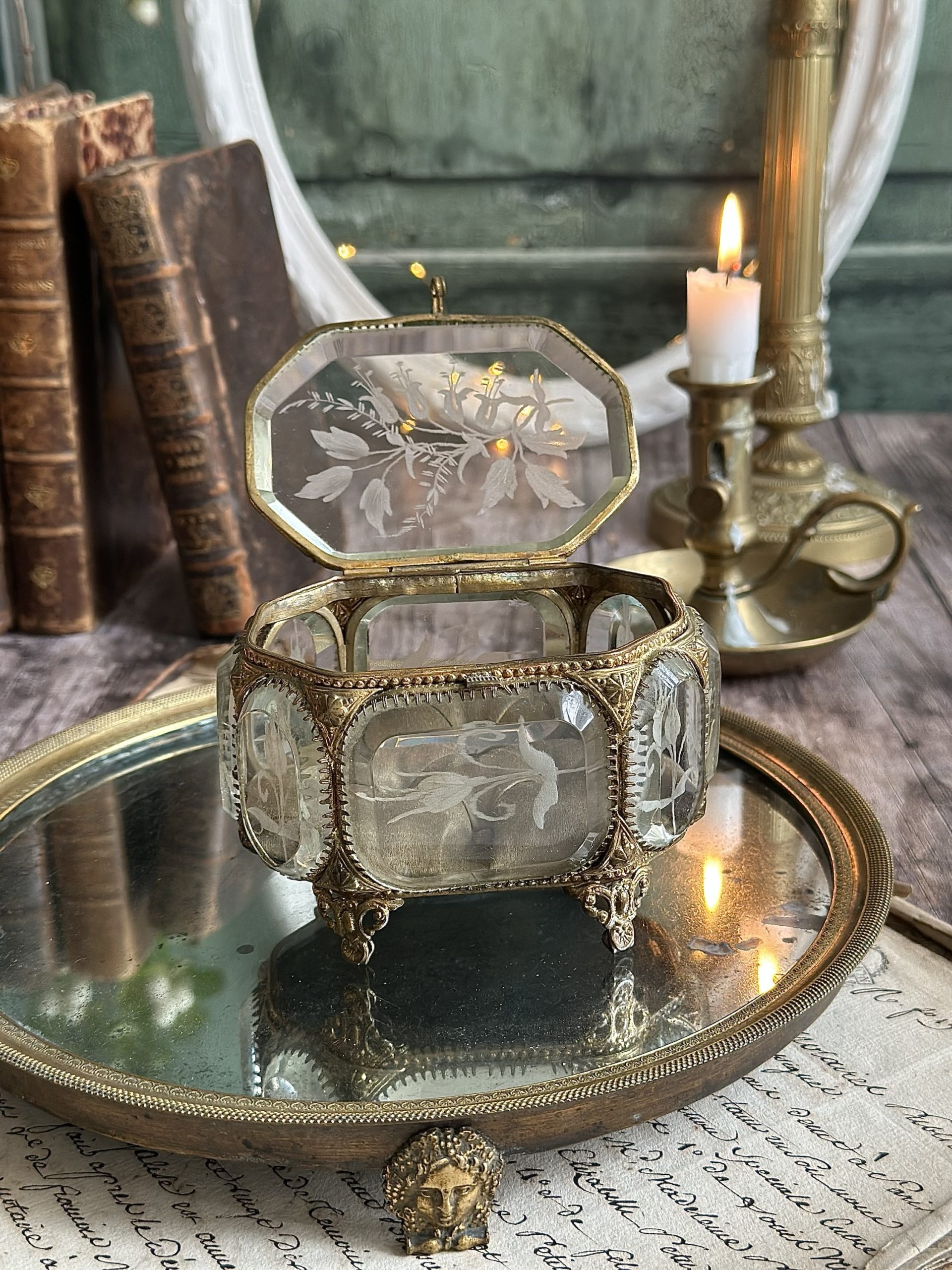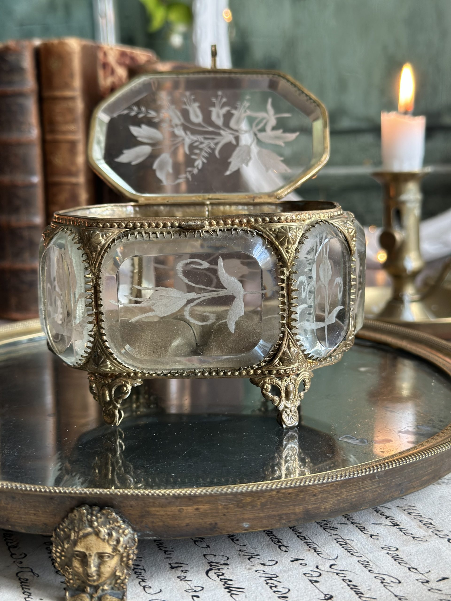 Sublime boîte à bijoux XIXème, cristal biseauté, gravé