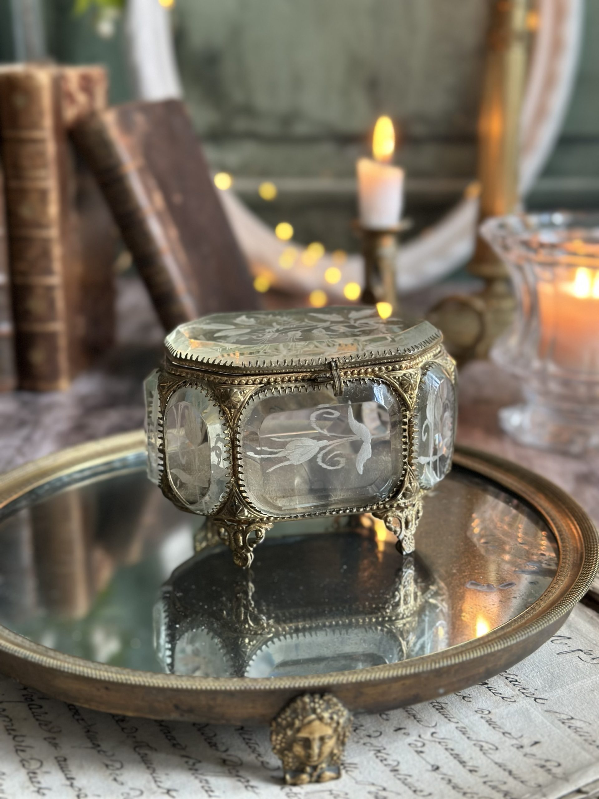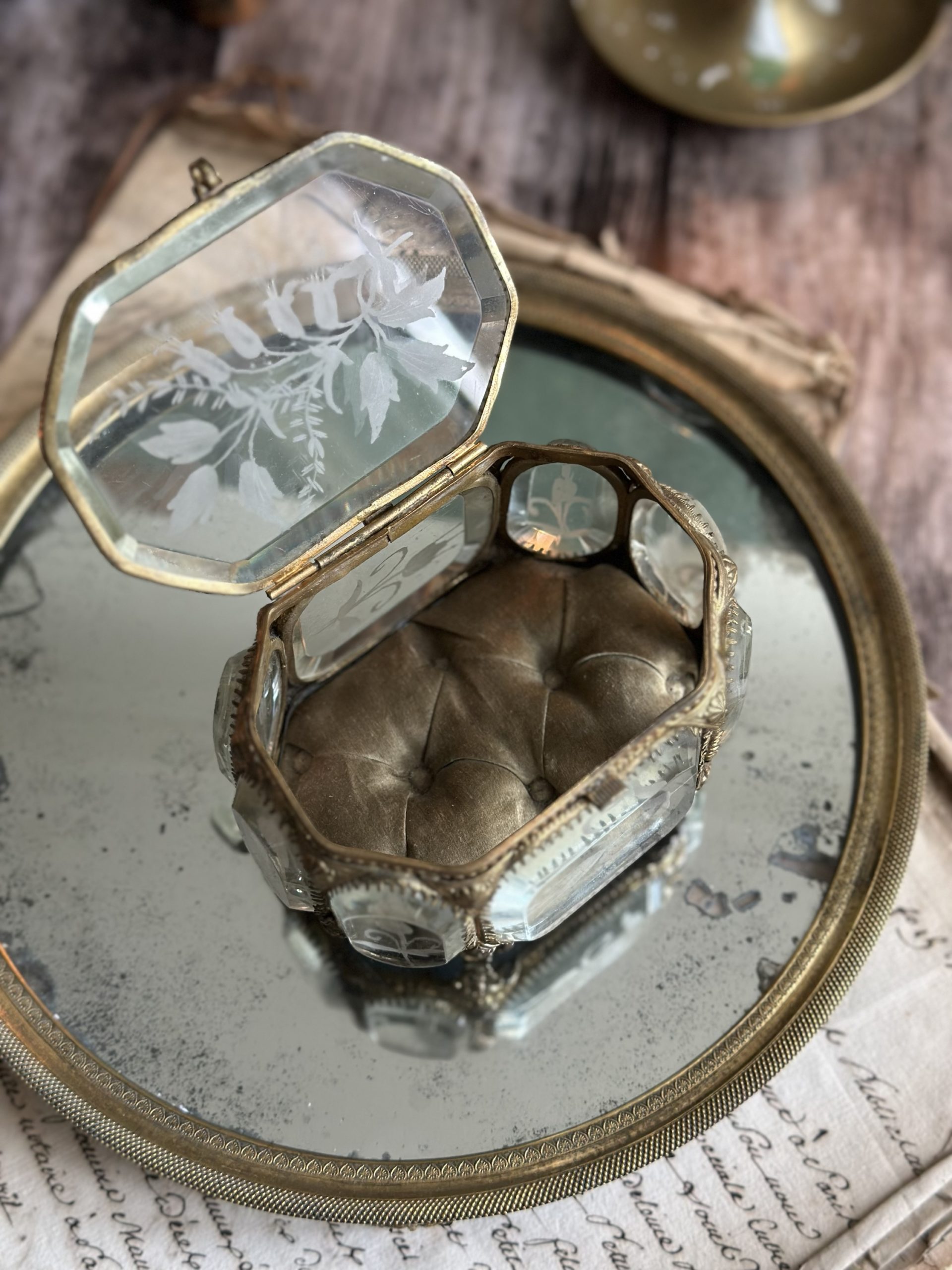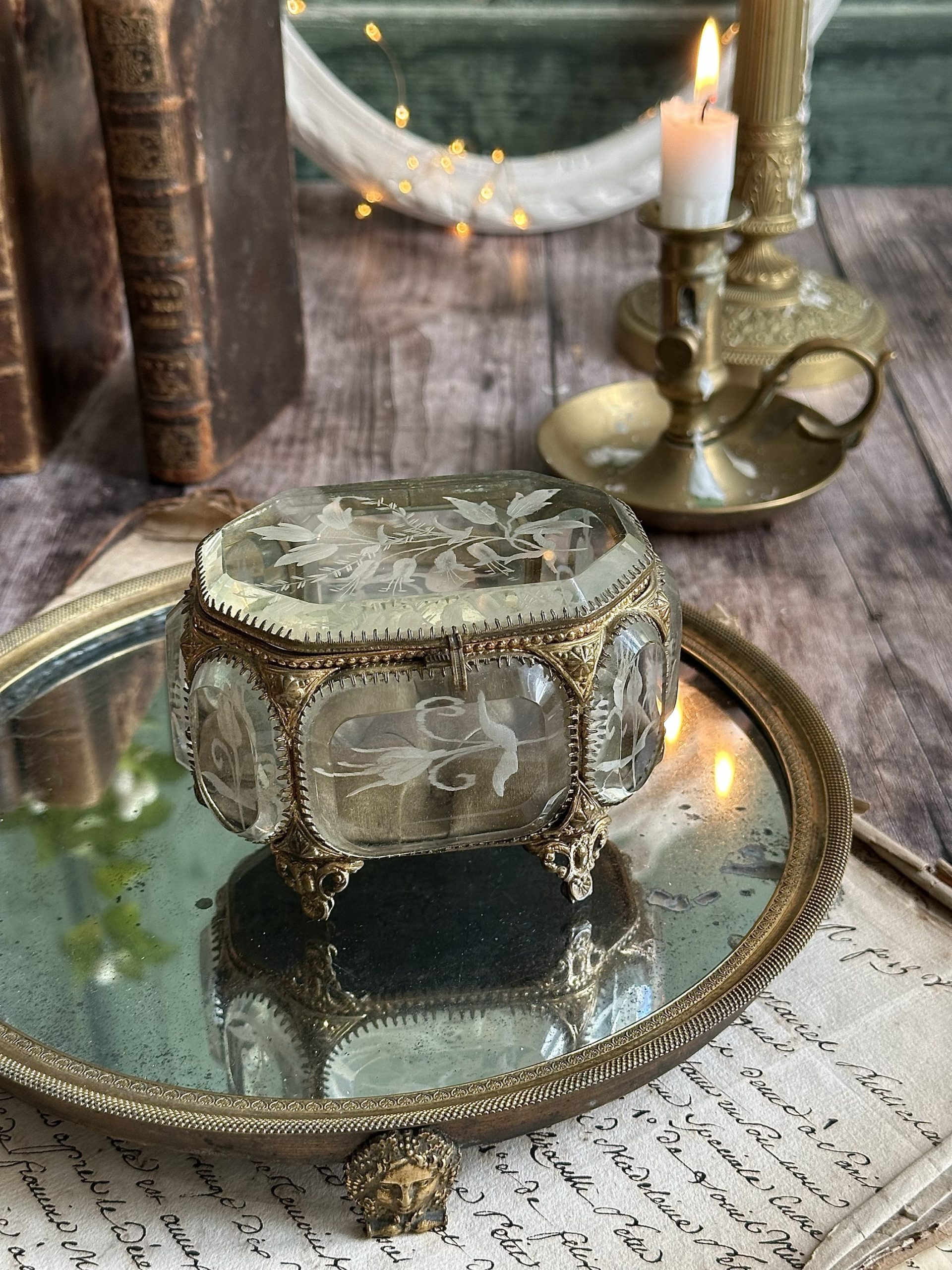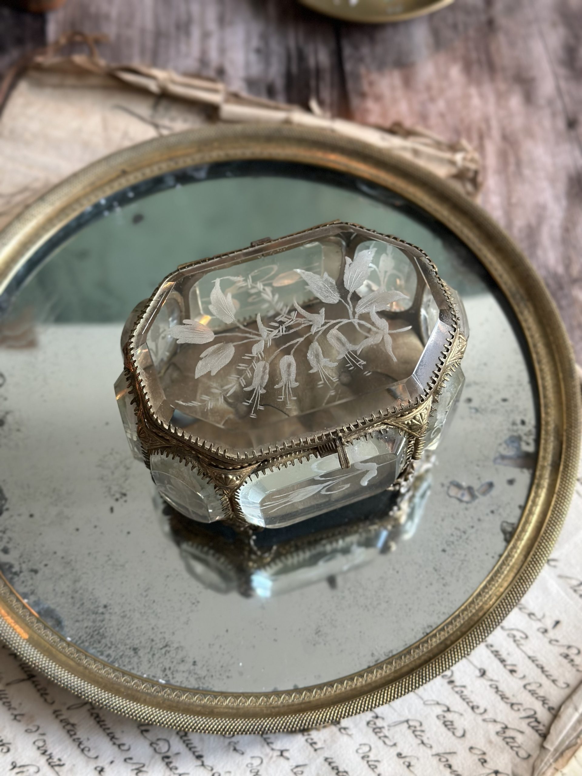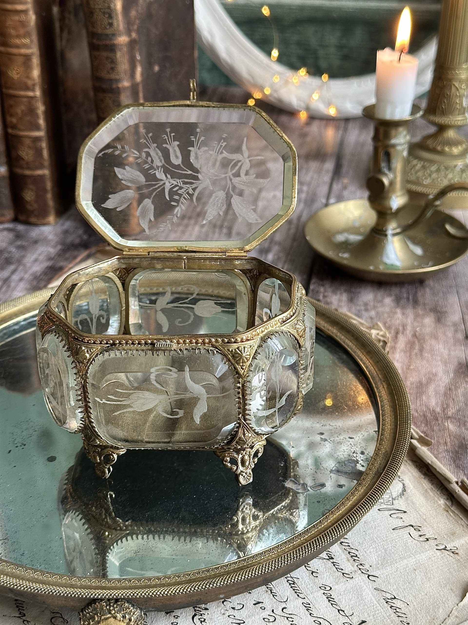 Sublime boîte à bijoux XIXème, cristal biseauté, gravé