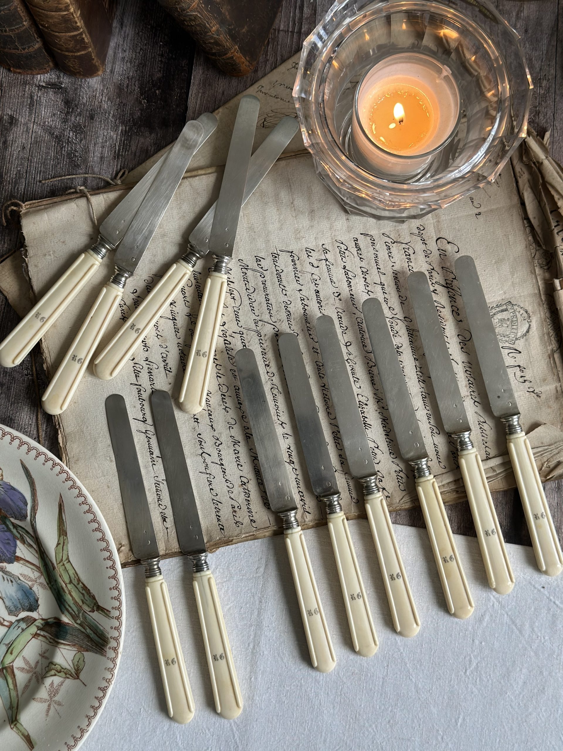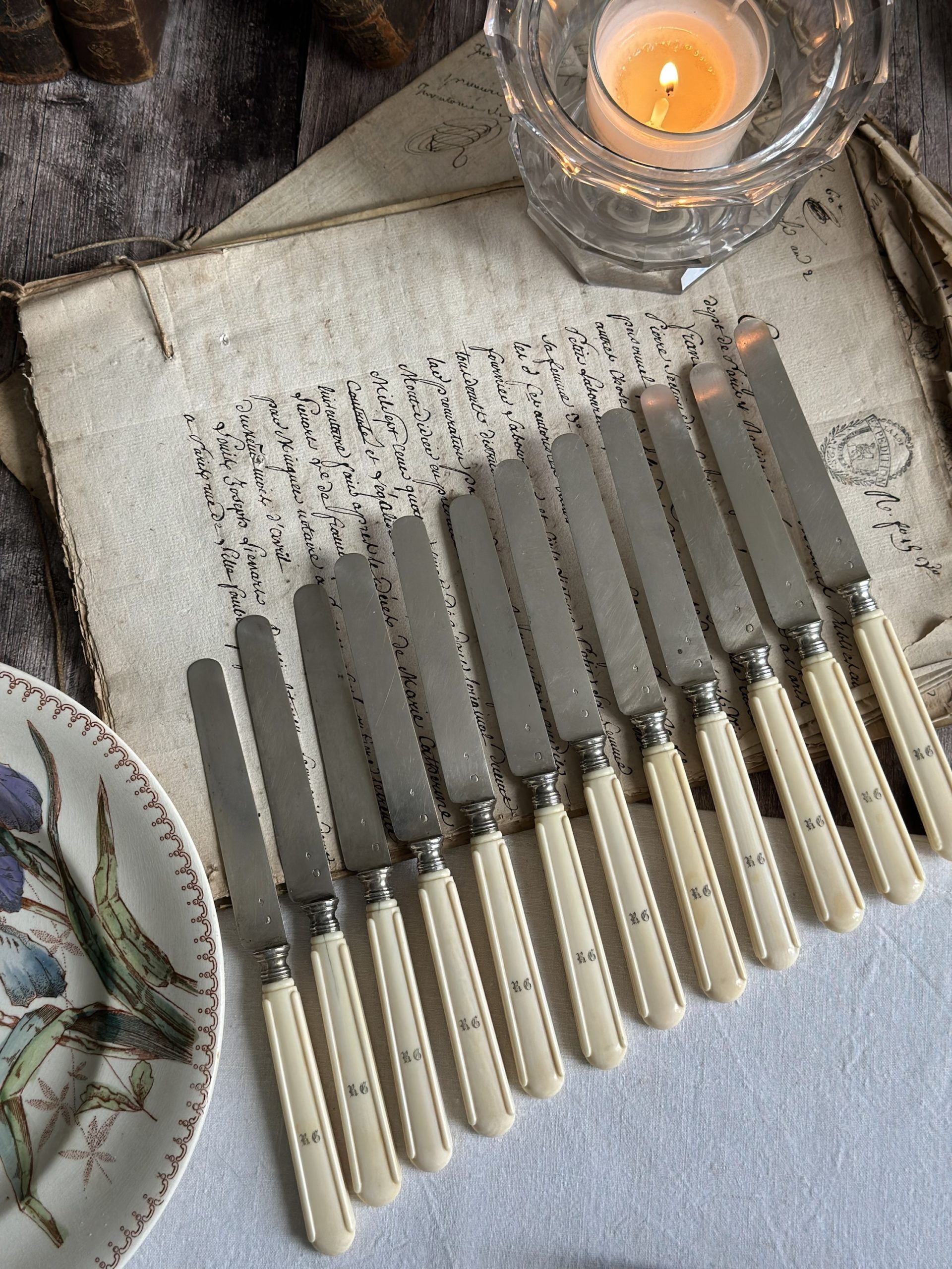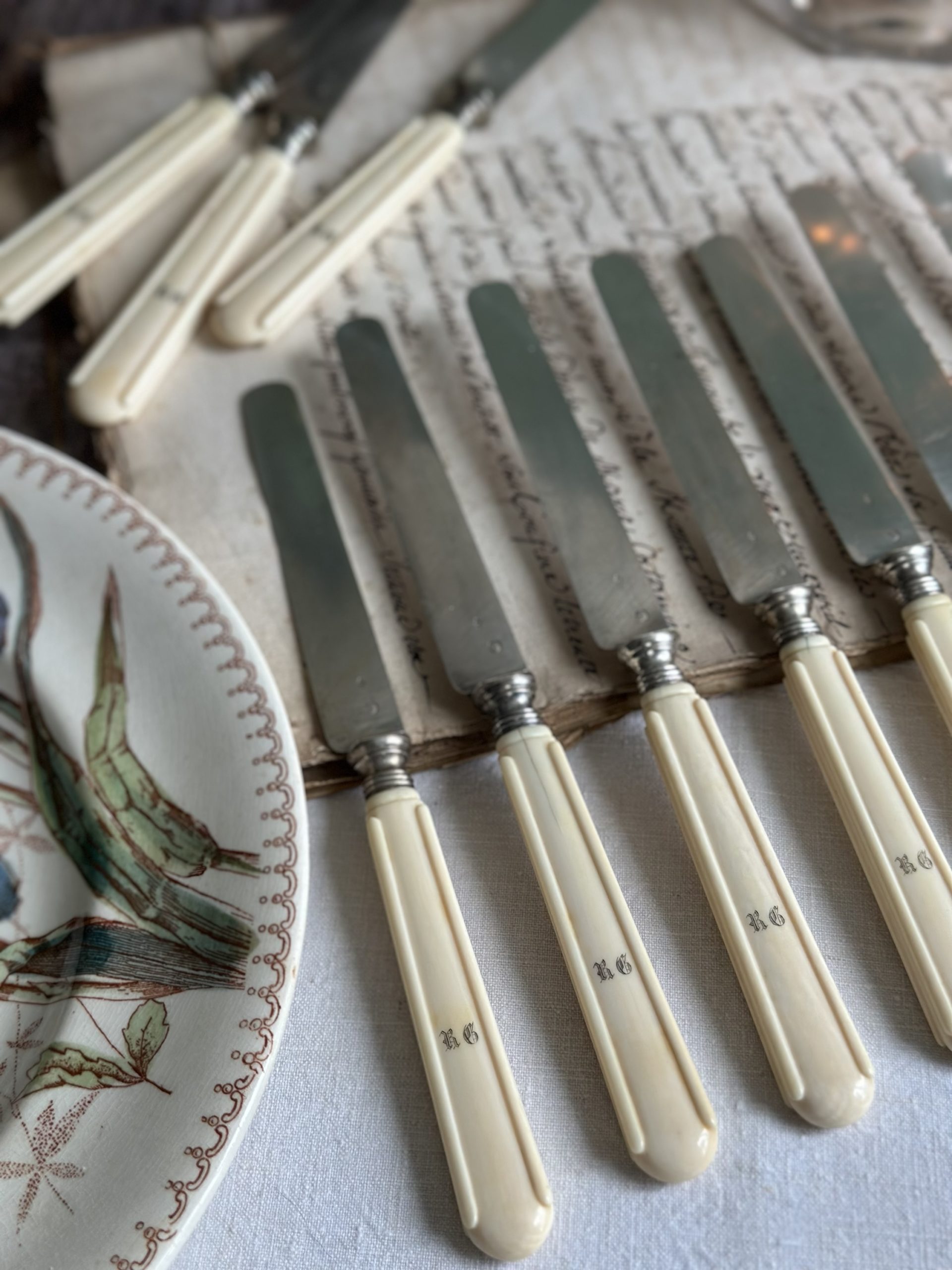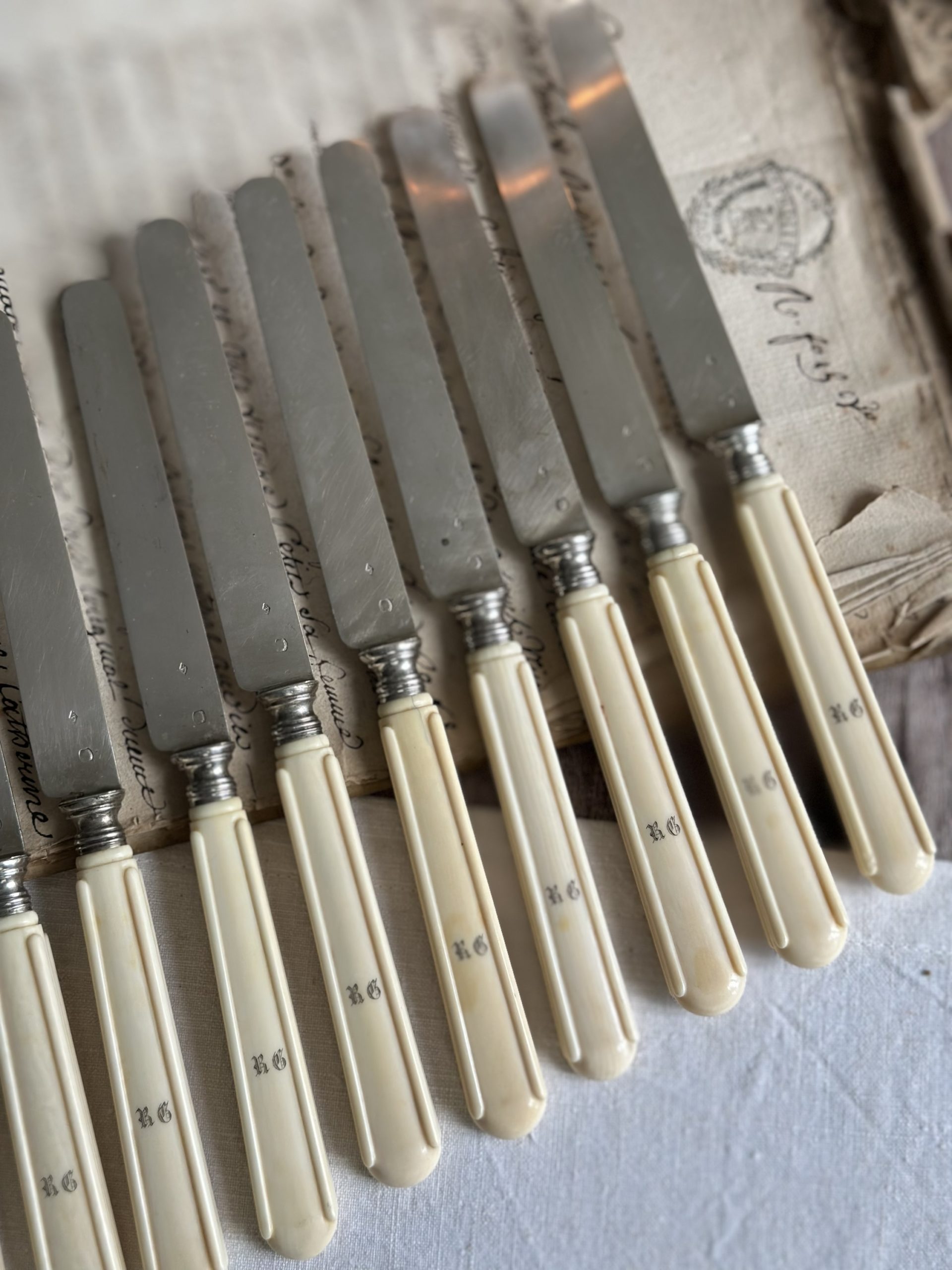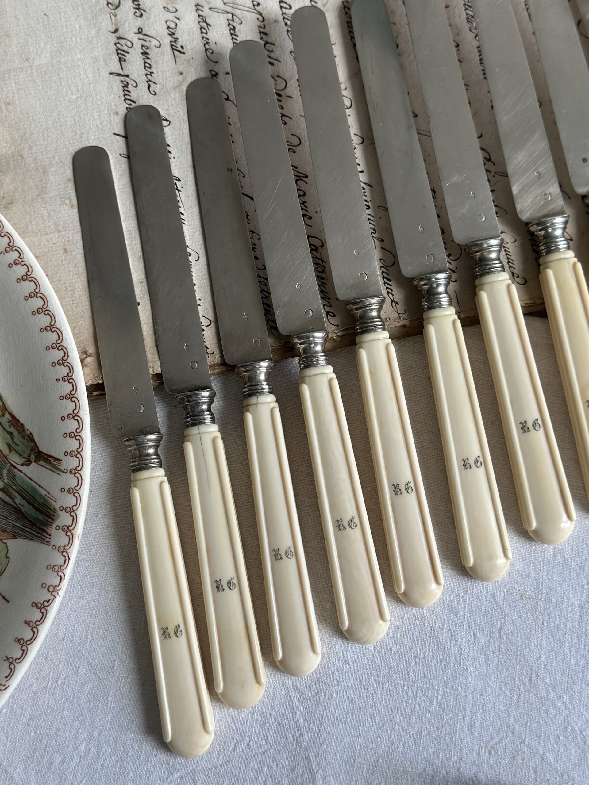 Suite de 12 couteaux à fruits, lames en argent (poinçon Minerve),  monogrammés RG