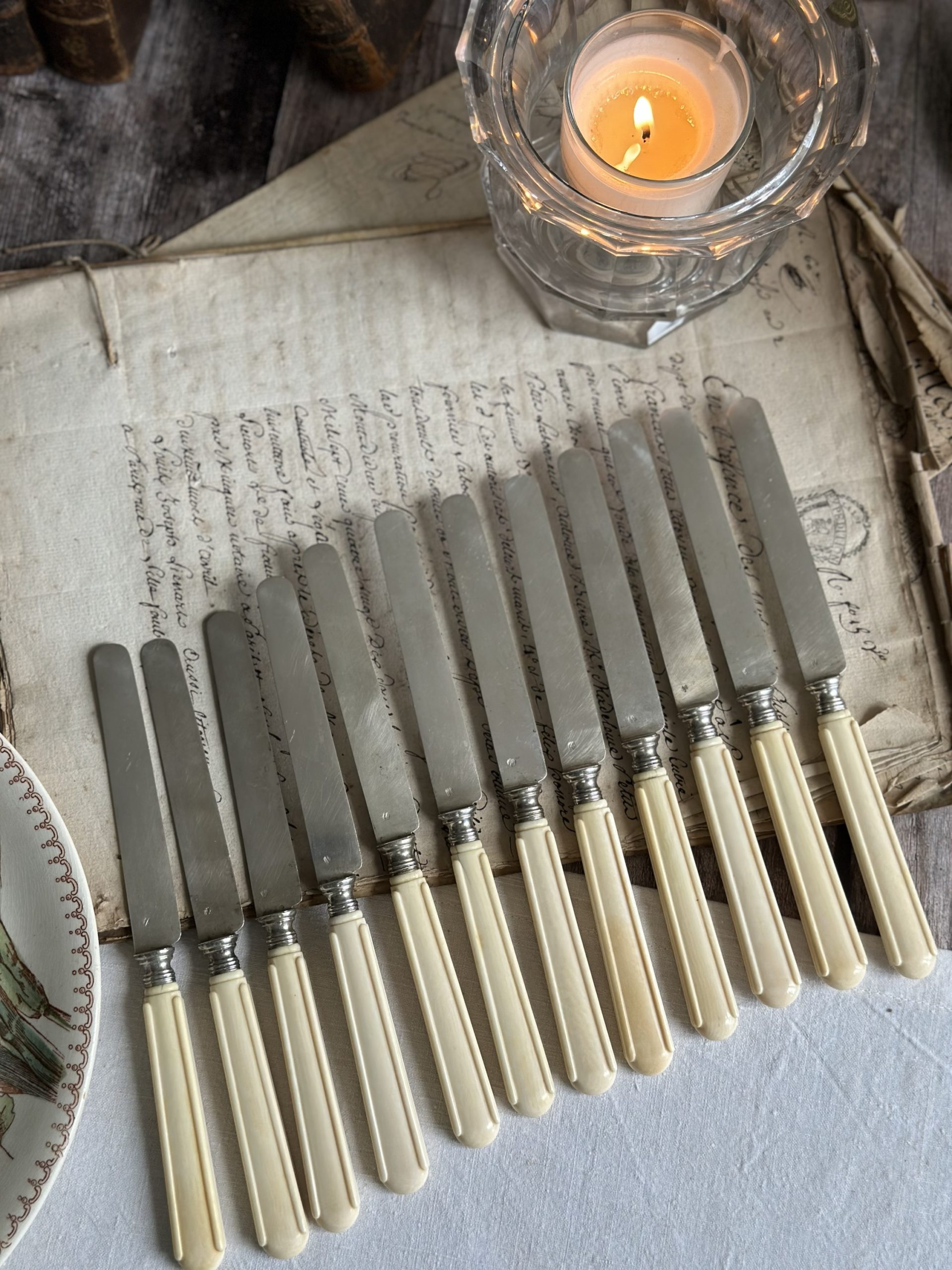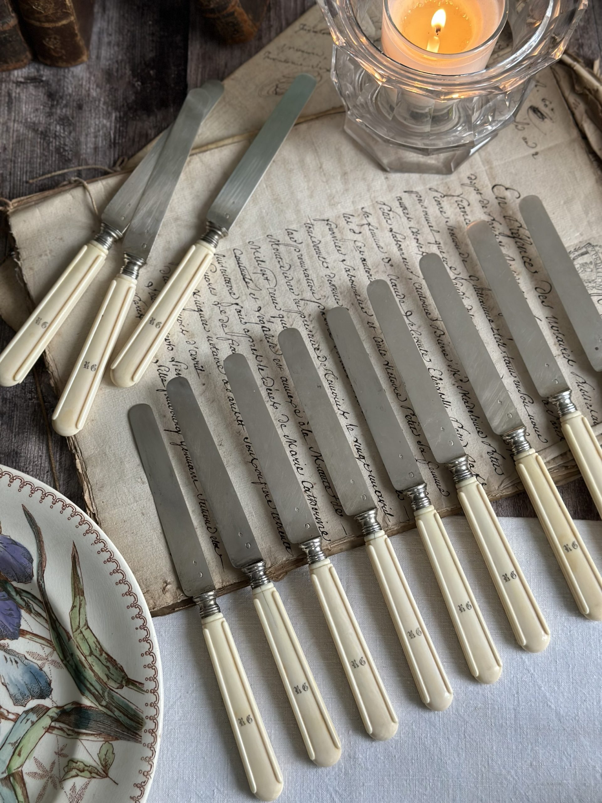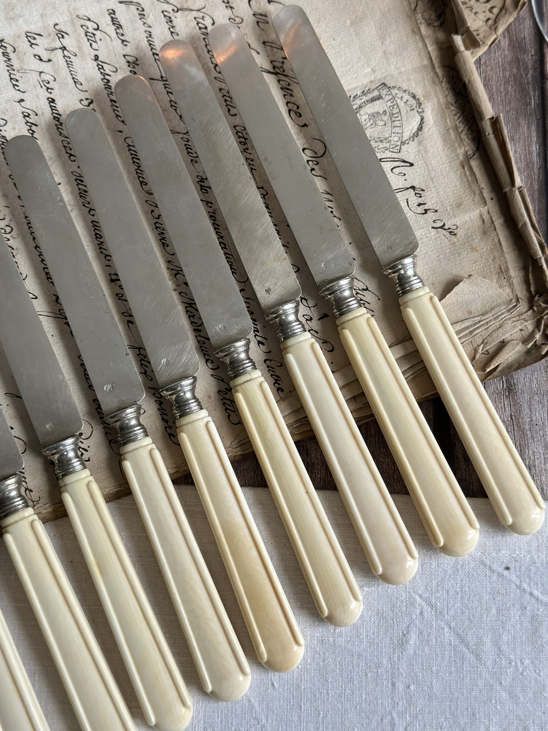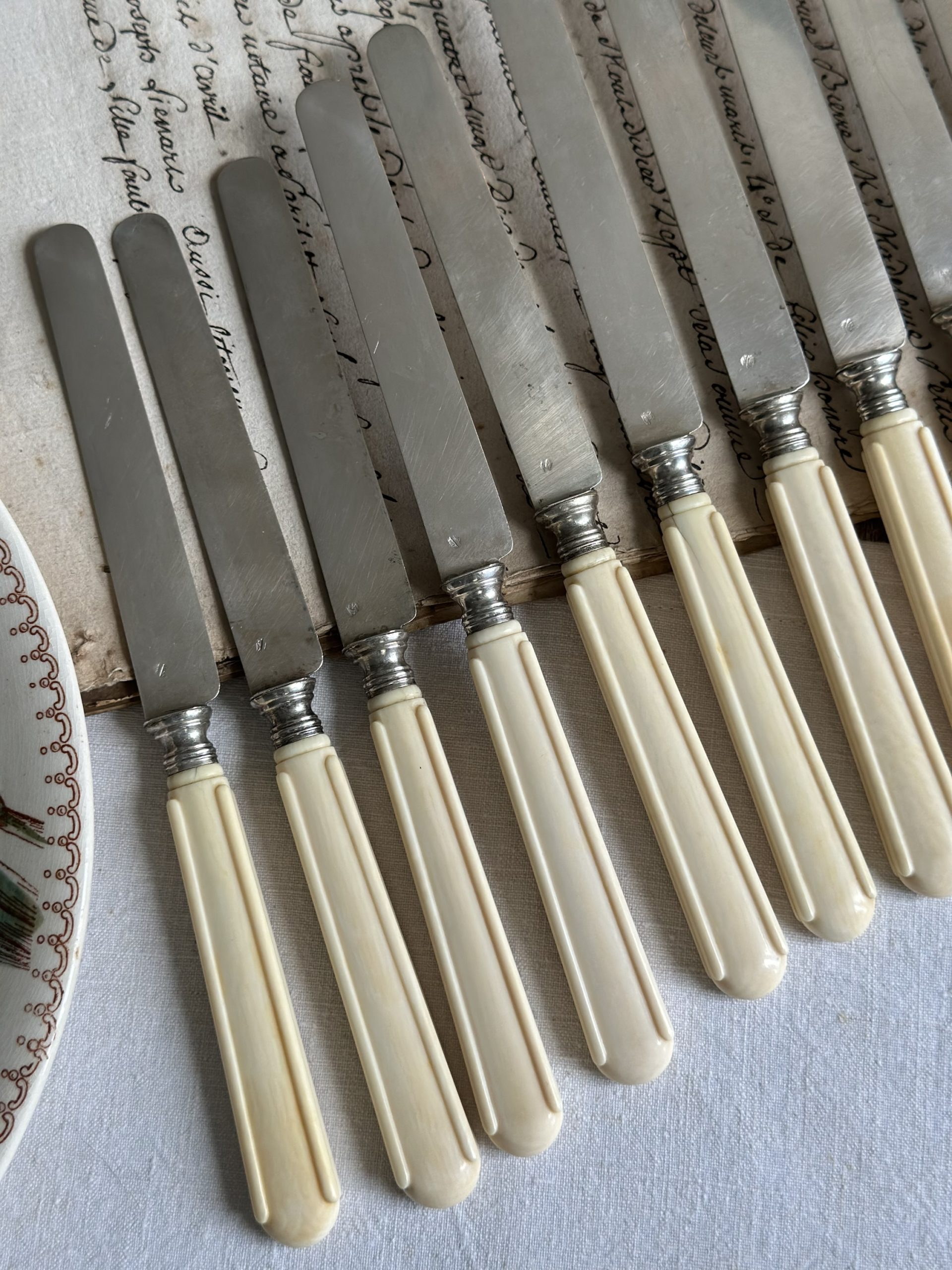 Suite de 12 couteaux à fruits, lame en argent massif (poinçon Minerve), monogrammés – époque Napoléon III