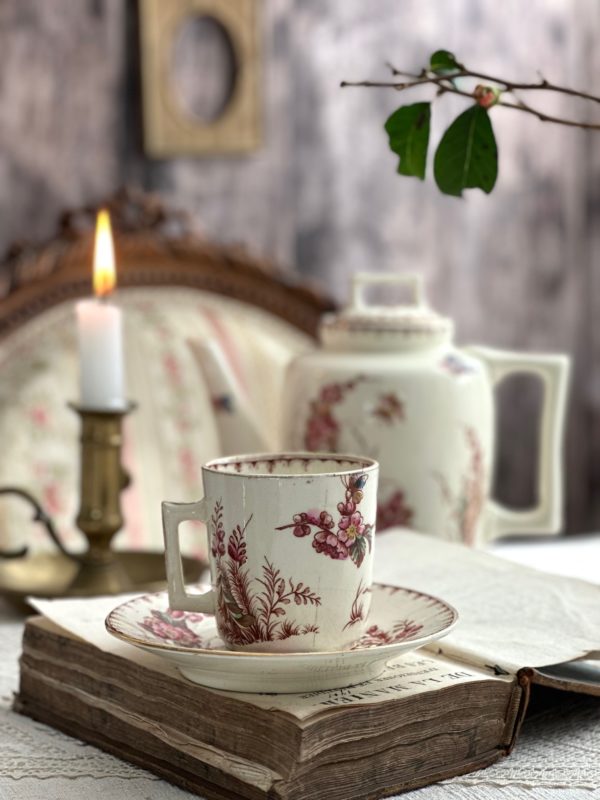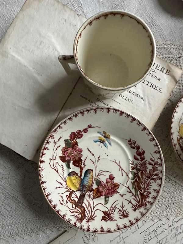 Tasse à café et sa sous-tasse polychrome Lunéville Mésange
